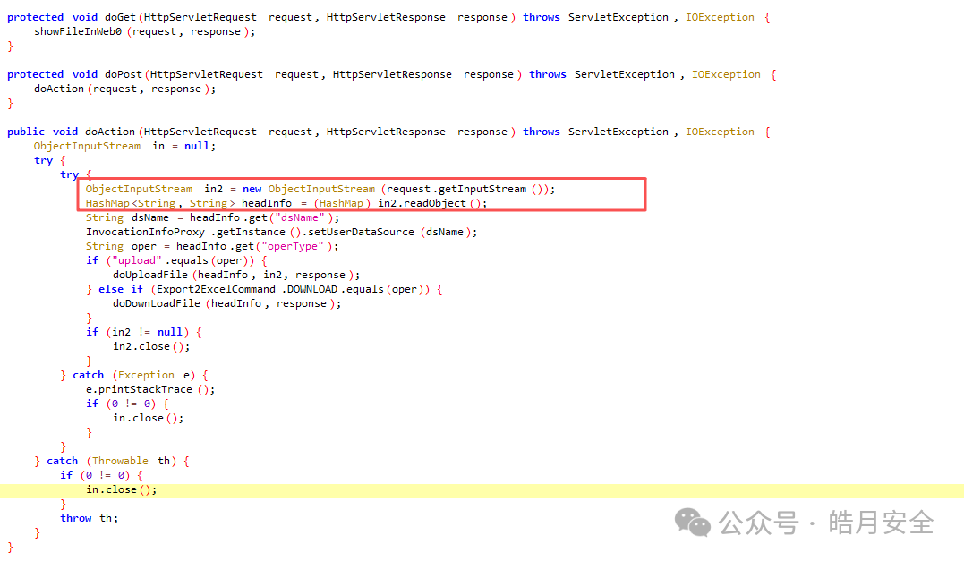 源代码如下获取HTTP数据包中的输入流,存入输出流in2中,然后调用readObject()方法对输出流in2进行反序列化,转换对象为一个hashmap数组headInfo,从headInfo中获取dsName和operType,当operType不为upload时,调用doDownLoadFile(headInfo,...