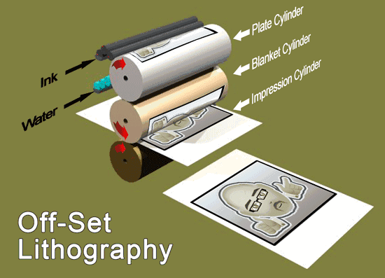 然后,由印刷部件的供墨装置向印版供墨,由于印版的非图文部分受到水的保护,因此,油墨只能供到印版的图文部分。最后是将印版上的油墨转移到乳皮上,再利用橡皮滚轮与压印滚筒之间的压力,将乳皮上的油墨转移到承印物上,完成一次印刷,所以,平版印刷是一种间接的印刷方式。