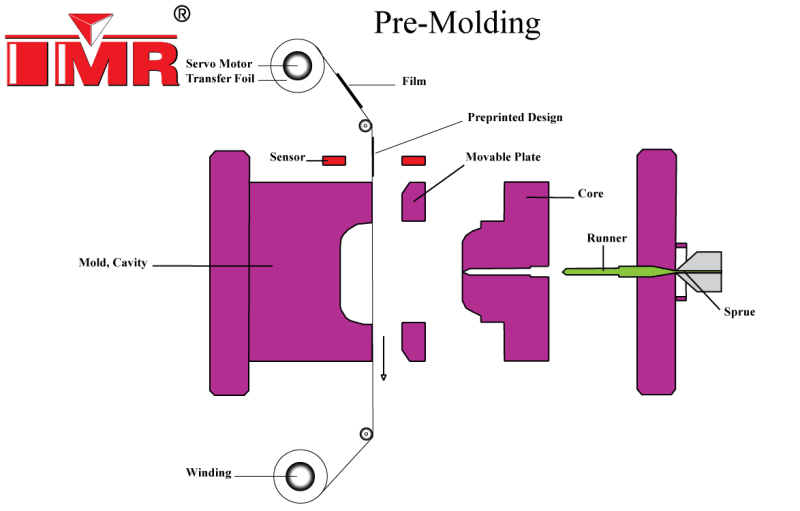 IMD注塑制程就是将已印刷冲型好的装饰薄膜片材放入注塑模内,然后将树脂注射在成型片材的背面油墨层,使树脂与薄膜片材接合成一体固化成型的技术。IMD制程包含IML、IMF和IMR,