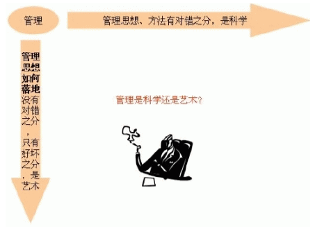 我们学校里、书本里学到的各种思想、方法,是有对错之分的,是科学。这是管理在横向上的维度。另外,我们的思想和方法如何真正“落地”,管理的推行过程却是没有对错之分的,只有好坏之分,这是管理在纵向上的维度,是艺术。