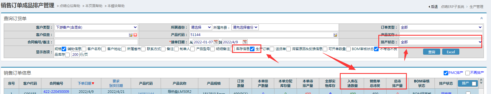 可以将排产状态设置成 全部,就可以看到本单的排产状况了,如下图所示