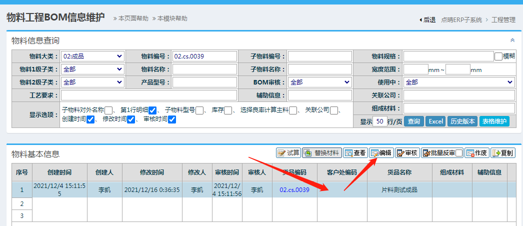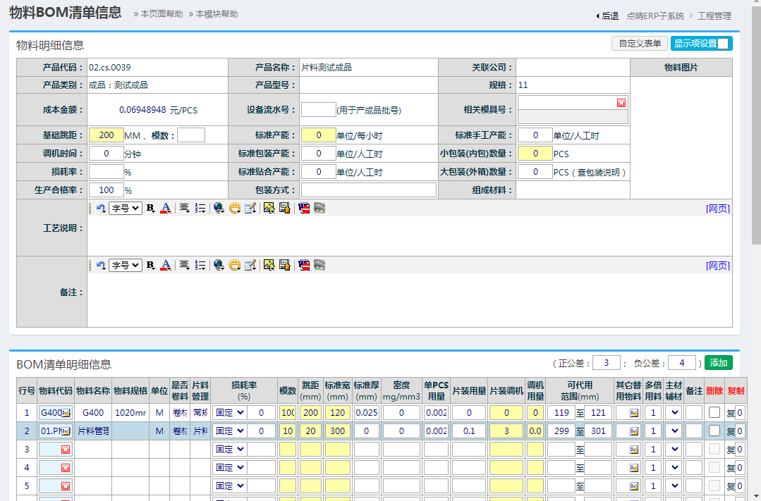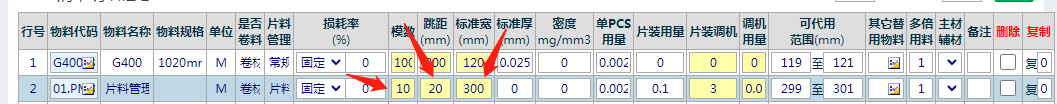 工程管理-生产BOM管理 进入界面后,选择对应的资料,点击编辑按钮 以下图例子作为对应说明 图示第一条明细为常规卷料,按正常的卷料用量来录入资料 第二条明细为片料资料,模数栏填写该片料1片能生产的数值,跳距栏填写该片料的长度,标准宽填写为该片料的宽度;对应填写的理解就是:尺寸为300*20的片材材料能生产10PCS产品 点晴模切ERP更多信息:http://moqie.clicksun.cn,联系电话:4001861886 该文章在 2024/10/14 9:20:39 编辑过 |
