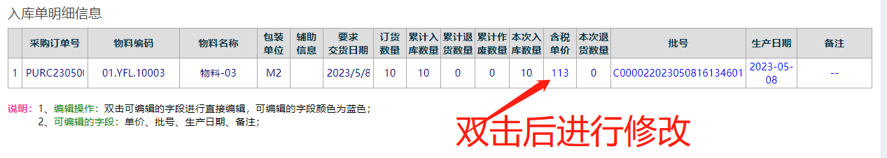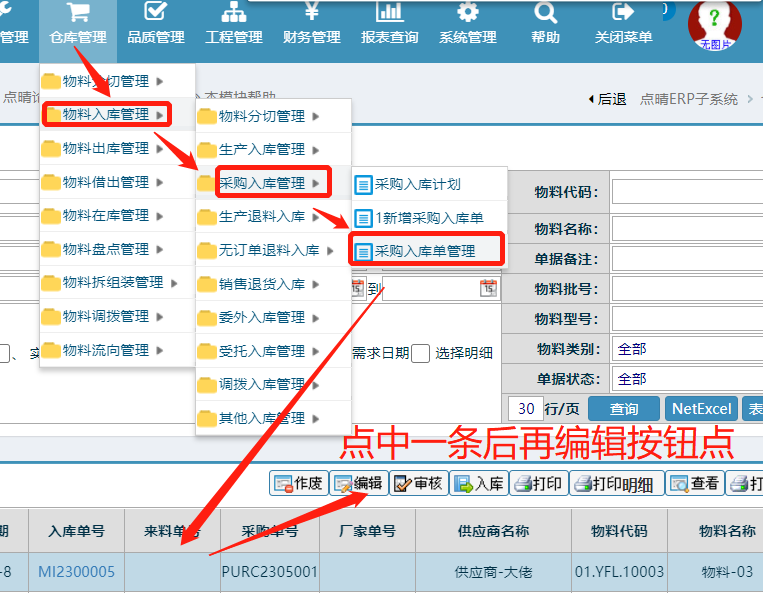 进入采购入库单管理,点中一条后再点编辑按钮,如下图: