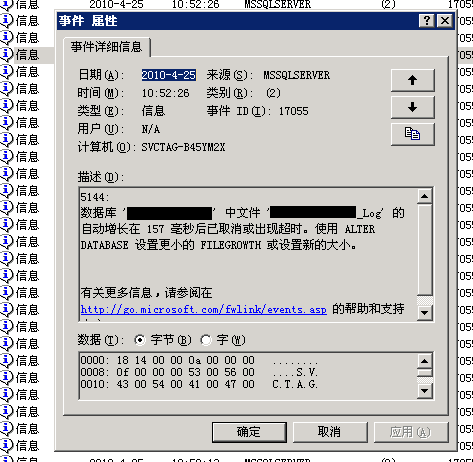 数据库 'xxx' 中文件 'xxx_Log' 的自动增长在 157 毫秒后已取消或出现超时。使用 Alter DATABASE 设置更小的 FILEGROWTH 或设置新的大小。