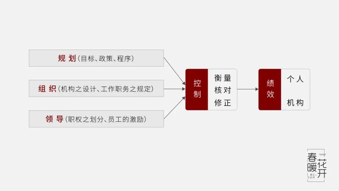 因为数字技术的影响,在管理中,人们越来越多探讨“赋能”、“激活”,这也是我自己在组织的数字化转型中探讨的核心命题。但是,管理者也需要清醒地认识到,“组织管控”依然是一个重要的职能,因为管理控制是保障达成绩效的核心职能之一。控制的重要性,我们可以用一张图表示出来。企业的规划(包括目标、政策、程序),组织(包括机构设计、工作职务的规定)以及领导职能(包括职权划分、员工激励)如何转换为组织与个人的绩效,需要在实现的过程中由控制来衡量、核对和修正。也就是说,如果没有控制,企业的规划无法变成企业的绩效,组织管理过程以及领导职能的发挥,也无法与绩效相关。控制之所以有意义,是因为控制本身是一个过程,管理者在运用控制职能的时候,需要明确目标与计划本身,需要保持管理活动的整个过程与目标和计划保持一致,做到这一点,才能够说控制的职能发挥得当。第一,预防危机的出现,因为有计划的收集信息可防止重大事故之产生。第二,使生产标准化,控制是需要把产品及提供的服务把标准化,从而尽量减少偏差。第三,考核员工的绩效,使员工的绩效得到衡量与指导并使绩效标准化,让员工能够有章可循,有依据去提升自己的行动。第四,修订/更新计划,通过控制发现的偏差,可以迫使组织切实推行计划,不至于到最后来不及调整。第五,保卫组织财产,控制本身能够很好监督变化,具有预警和提示作用,这样可以迫使管理者负起财务责任并保存资产。