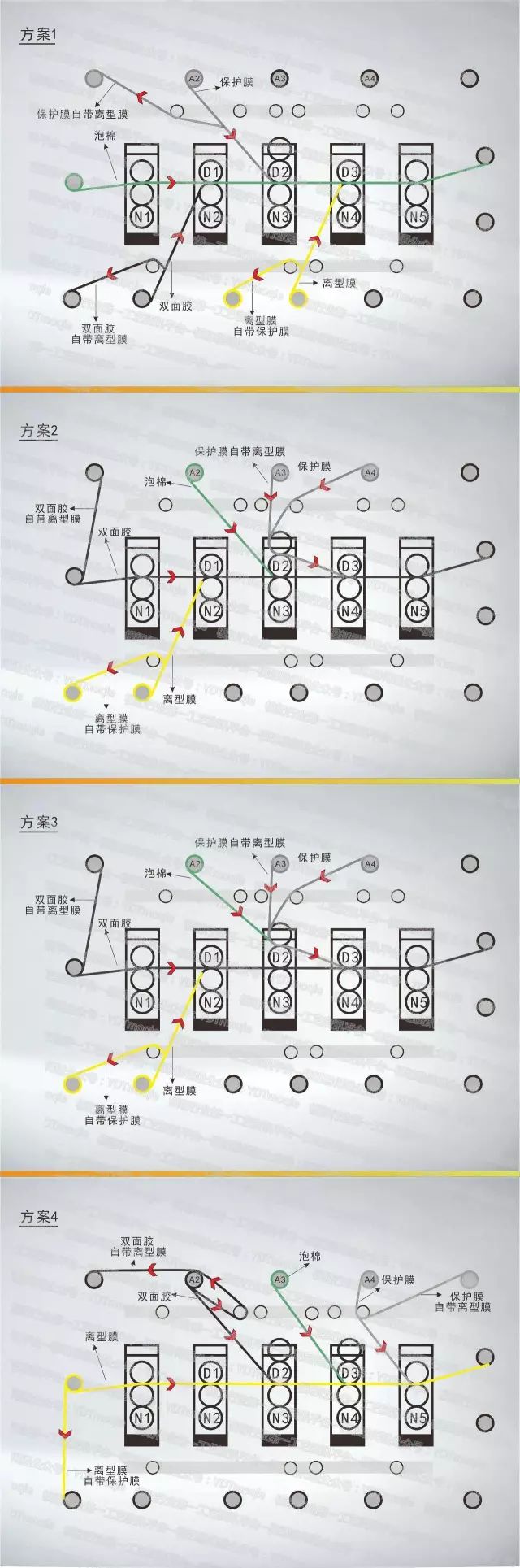 使用平刀模切设备,只能按部就班进行贴合,但使用圆刀模切设备进行作业,每个圆刀模切师傅都有自己的想法,而圆刀设备,能把不同的想法实现。同样结构的材料复合,圆刀机实现方法: