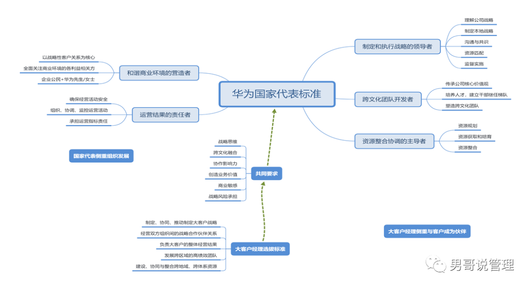 这张图显示的就是华为非常重要的高级干部,国家代表的任职要求,国家代表是华为以国家为单位,负责该国华为的经营的最高负责人,大的国家代表处可以达到上千人的规模,数十亿美金的每年销售收入,可以说是华为的“封疆大吏”,这是以区域维度进行划分的,华为目前服务170多个国家和地区,也就是说华为至少在全球部署上百个各种大小的国家代表处,他们是华为海外业务的组织力量。这是在2009年,由IBM对于国家代表层级的所需要的领导力和标准进行的重新梳理,梳理出来的角色、能力和经验的要求,比如对于国家代表的基础经验和特殊经验分别如下:而在这个基础上,针对国家代表的针对性经验就是:盈亏担当,国际业务管理,管理多个职能,营造外部环境,业务与职能、前线与后端的工作转化。IBM的专家在这个基础上,从三大方面提出了对于华为国家代表持续胜任该岗位的转身要求,分别如下:从管理组织到培育组织