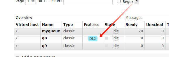 DLX(Dead-Letter-Exchange) 死信交换器,消息在一个队列 A 中变成死信之后,它能被重新被发送到另一个 B 交换器中。其中 A 队列绑定了死信交换器,那么在Management UI 界面会看到 DLX 标识,而 B 交换器就是一个普通的交换器,无需配置。