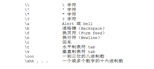字符常量是括在单引号里,例如,'x',且可存储在一个简单的字符类型变量中。一个字符常量可以是一个普通字符(例如 'x')、一个转义序列(例如 '\t')或者一个通用字符(例如 '\u02C0')。在 C# 中有一些特定的字符,当它们的前面带有反斜杠时有特殊的意义,可用于表示换行符(\n)或制表符 tab(\t)。namespace EscapeChar