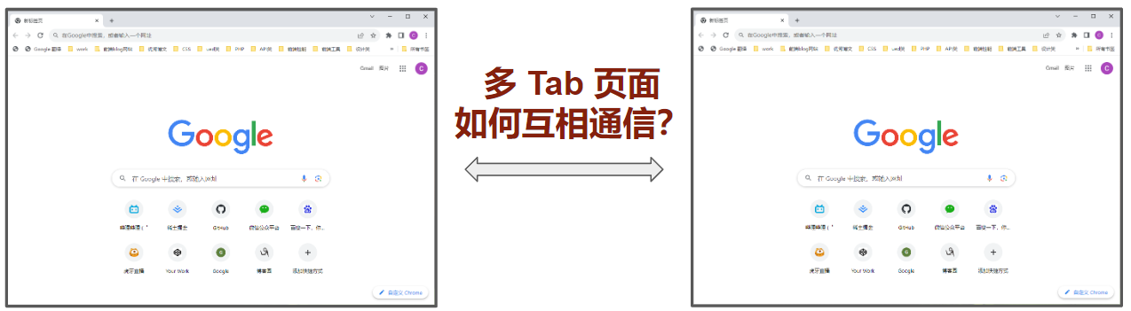 交互传输结果,与上述两个动图是一致的,就不额外贴图了,但是基于 我们通过 当然,由于 虽然看起来这种方式最不优雅,但是结合兼容性一起看, localstorage 反而是兼容性最好的方式。在数据量较小的时候,性能相差不会太大,反而可能是更好的选择。 我基于上面三种方式:Broadcast Channel、SharedWorker 与 localStorage,都实现了一遍下面这个跨 Tab 页的 CSS 联动动画: 三种方式的代码都不多,感兴趣的可以戳这里:Github - broadcastAnimation 实际应用思考当然,上面的实现其实有很大一个瑕疵。 那就是我们只顾着实现通信,没有考虑实际应用中的一些实际问题: