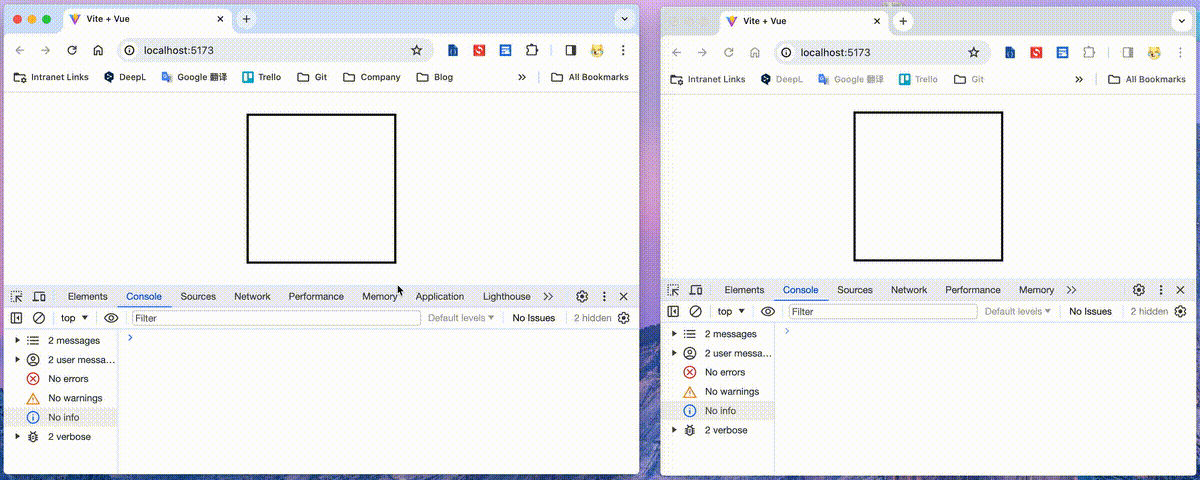 同时,Broadcast Channel 遵循浏览器的同源策略。这意味着只有在同一个协议、主机和端口下的窗口才能正常进行通信。如果窗口不满足同源策略,将无法互相发送和接收消息。 因为有同源限制,我们需要起一个服务,这里我基于 Vite 快速起了一个 Vue 项目,简单的基于 其核心代码非常简单: <template> <div id="j-main"> // ... </div> </template> <script> import { onMounted } from 'vue'; export default { setup() { function createBroadcastChannel() { broadcastChannel = new BroadcastChannel('broadcast'); broadcastChannel.onmessage = handleMessage; } function sendMessage(data) { broadcastChannel.postMessage(data); } function handleMessage(event) { console.log('接收到 event', event); // TODO: 处理接收到信息后的逻辑 } function resizeEventBind() { window.addEventListener('resize', () => { const pos = getCurPos(); sendMessage(pos); }); } // 计算当前元素距离显示器窗口右上角的距离 function getCurPos() { const barHeight = window.outerHeight - window.innerHeight; const element = document.getElementById('j-main'); const rect = element.getBoundingClientRect(); // 获取元素相对于屏幕左上角的 X 和 Y 坐标 const x = rect.left + window.screenX; // 元素左边缘相对于屏幕左边缘的距离 const y = rect.top + window.screenY + barHeight;// 元素顶部边缘相对于屏幕顶部边缘的距离 return [x, y]; }