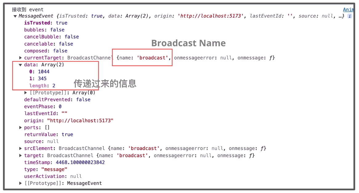 在 这样,当我们同时打开两个窗口,移动其中一个窗口,就可以向另外一个窗口发生当前窗口希望传递过去的信息,在本例子中就是 假设 可以看到,如果我们同时打开两个一个的页面,当触发右边页面的 Resize,左边的页面会收到基于 而一个完整的 Event 信息如下: 譬如,传递过来的信息放在 data 属性内、同时也可以获取当前的的 Broadcast Name 等。 基于 BroadcastChannel,就可以实现每个 Tab 内的核心信息互传, 可以得知当前在线设备数,再基于这些信息去完成我们想要的动画、交互等效果。 这里的核心点,还是: