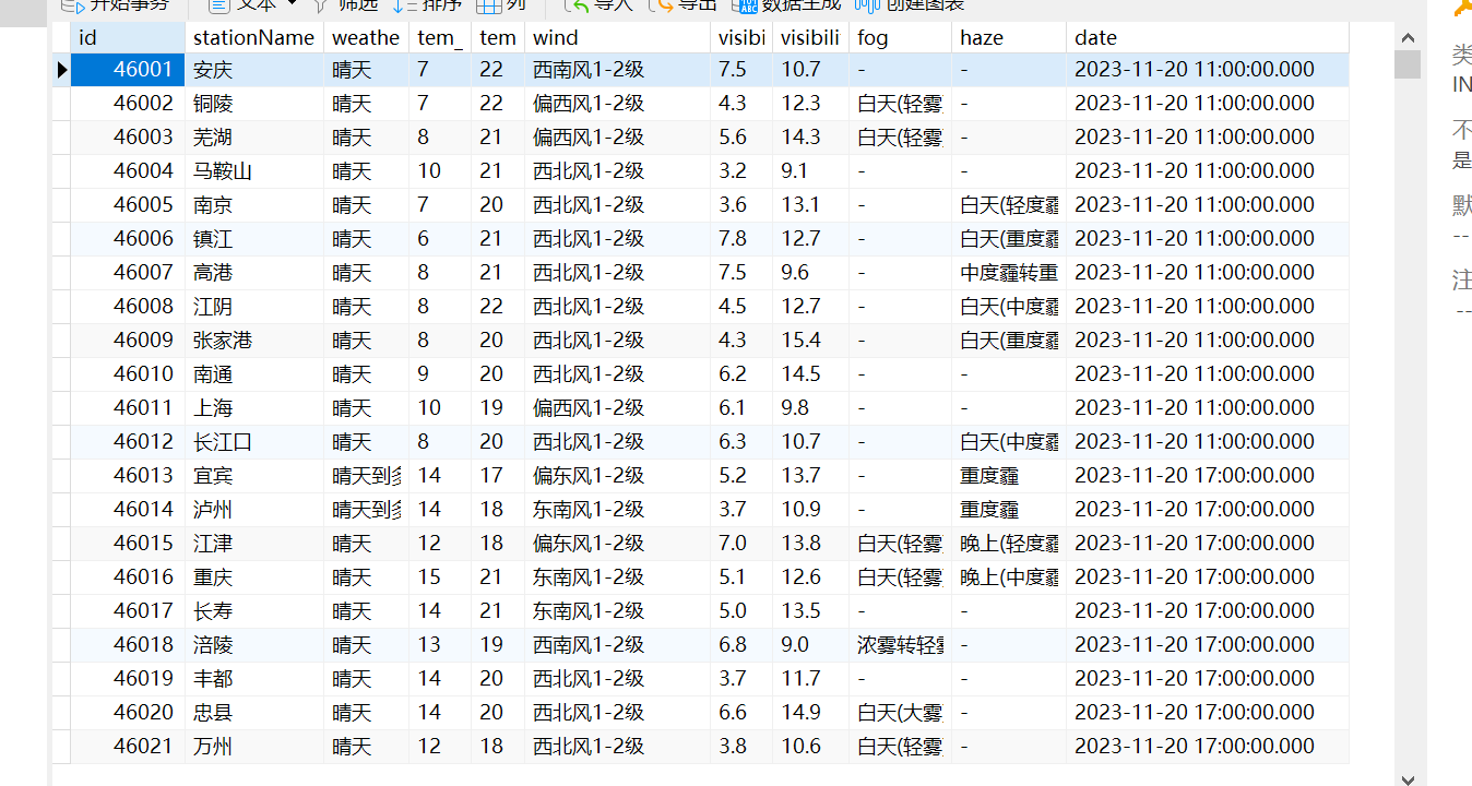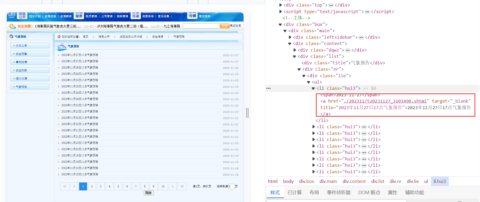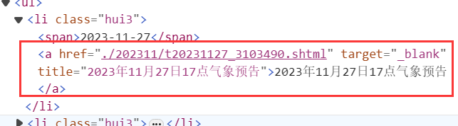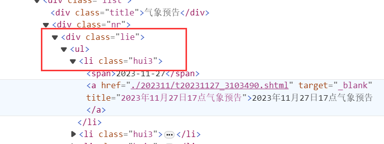 构建每一天的URL获取到了每一页的URL之后,我们发现在每一页的URL都可以获取关于每一天的URL信息,如下所示: 可以进一步构建每一天的URL,同时可以根据a的文本获取时间,当然也可以通过其他方式获取时间,但是这种可以获取到11点或者17点。 代码如下所示: for (int i = 0; i < Urls.Length; i++) 在这一步骤需要注意的是XPath的书写,以及每一天URL的构建,以及时间的获取。 XPath的书写: var nodes = doc.DocumentNode.selectNodes("//div[@class=\"lie\"]/ul/li"); 表示一个类名为"lie"的div下的ul标签下的所有li标签,如下所示: 构建每一天的URL: var a = nodes[j].ChildNodes[3]; 这里获取li标签下的a标签,如下所示: string urlText = a.GetAttributeValue("href", ""); 这段代码获取a标签中href属性的值,这里是./202311/t20231127_3103490.shtml。 string urlText = a.GetAttributeValue("href", ""); 这里是在拼接每一天的URL。 var name = nodes[j].ChildNodes[3].InnerText; 这里是从文本中获取时间,比如文本的值也就是name的值为:“2023年7月15日17点气象预告”,name获得的date就是2023-7-15 17:00。 // 将数据存入SQLite数据库 这里是将数据存入数据库中,ORM使用的是SQLSugar,类DayUrl如下: internal class DayUrl 最后获取每一天URL的效果如下所示: 获取温度数据需要获取的内容如下: 设计对应的类如下: internal class WeatherData 增加了一个时间,方便以后根据时间获取。 获取温度数据的代码如下: var list = db.Queryable<DayUrl>().ToList(); |