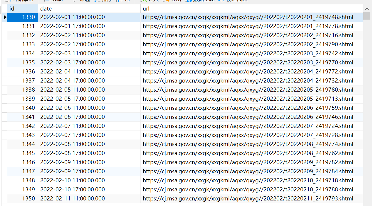 1、需求想要获取网站上所有的气象信息,网站如下所示: 目前总共有67页,随便点开一个如下所示: 需要获取所有天气数据,如果靠一个个点开再一个个复制粘贴那么也不知道什么时候才能完成,这个时候就可以使用C#来实现网页爬虫获取这些数据。 2、效果先来看下实现的效果,所有数据都已存入数据库中,如下所示: 总共有4万多条数据。 3、具体实现构建每一页的URL第一页的网址如下所示: 最后一页的网址如下所示: 可以发现是有规律的,那么就可以先尝试构建出每个页面的URL // 发送 GET 请求 这里使用了HtmlAgilityPack