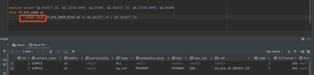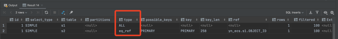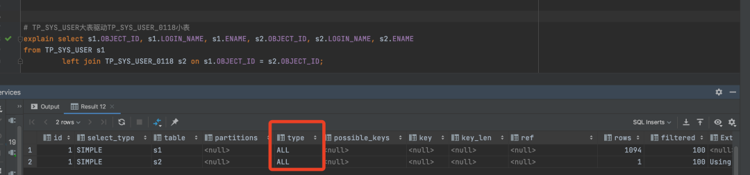 通过explain分析SQL的执行计划: 我们发现两个表的type都是ALL:表示全表分析,然后才找到匹配的行,我们可以通过字段rows看到查询的行数据。 场景二:以小表驱动大表