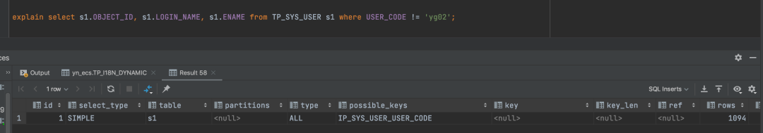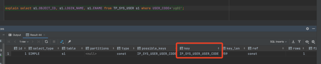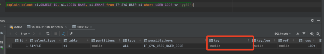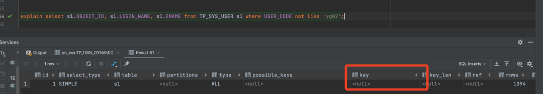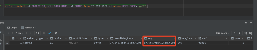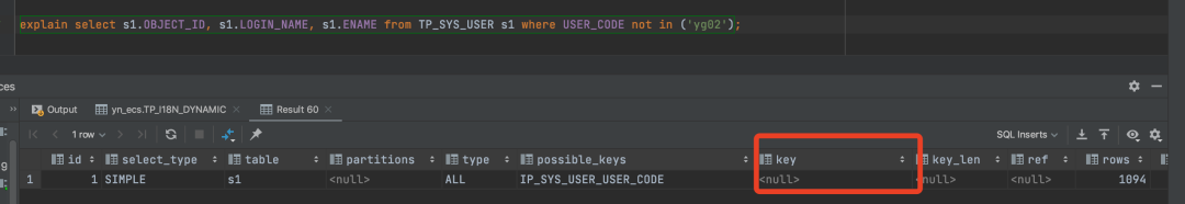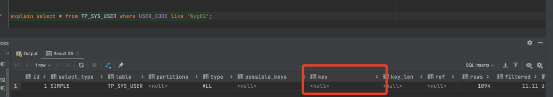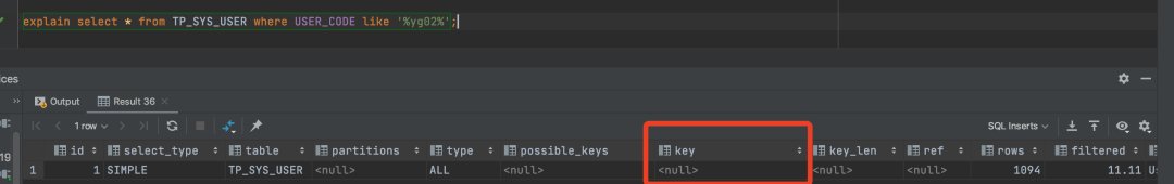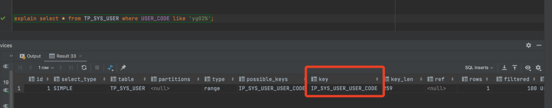 通过explain分析SQL的执行计划: 我们可以看到key(实际使用的索引)是有值的: 执行结果中key有值:表示查询中实际使用的索引为IP_SYS_USER_USER_CODE。 场景二:使用like左模糊查询