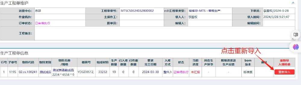 ![]() ![]() 情况描述: 修改过BOM后,工单不会跟着改变 要重新导入最新的BOM明细才行,前提是没有发料才允许重新导入 点击进入 如下图 点中某张工单后再点击查看 如下图: 在新窗囗再点击重新导入 如下图