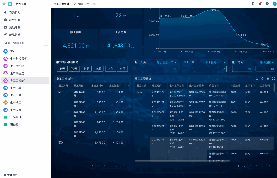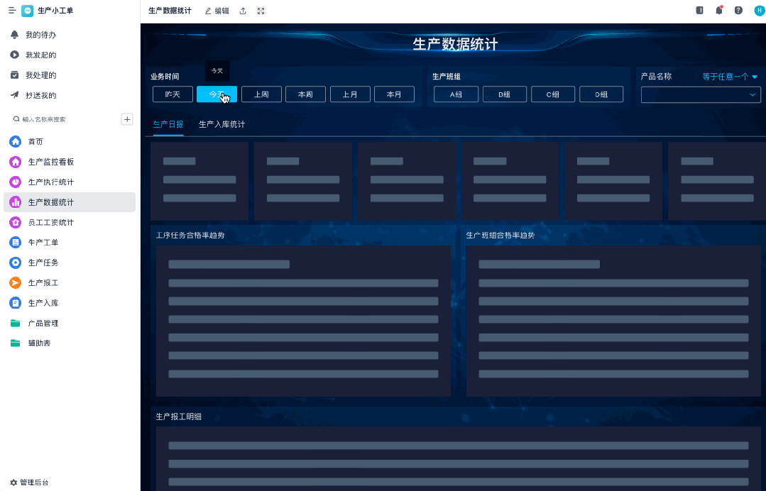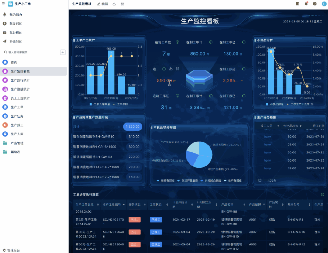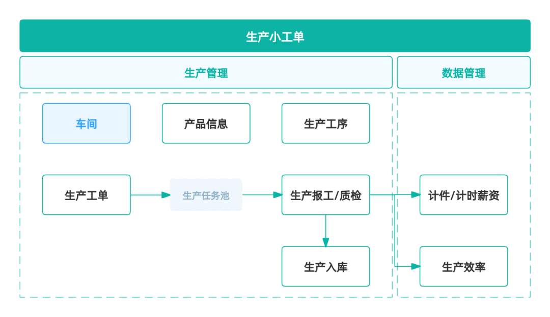 生产小工单是什么?生产小工单是如何与生产管理紧密相连的?生产小工单的结构是怎样的?生产小工单又有着什么样的功能呢?本文将从零开始,深入解析生产小工单。全文干货满满,不容错过,建议收藏!! 在了解生产小工单之前,首先要知道什么是生产管理! 一、什么是生产管理1、生产管理的定义生产管理(Production Management)是计划、组织、协调、控制生产活动的综合管理活动。内容包括生产计划、生产组织以及生产控制。通过合理组织生产过程,有效利用生产资源,经济合理地进行生产活动,以达到预期的生产目标。 2、生产管理的六大核心生产管理涉及到多个核心方面的活动和功能,六大核心内容有:生产计划和排程、物料采购和供应链管理、生产过程监控、生产设备和资源管理、质量管控、绩效评估和改进。 (1)生产计划和排程: · 制定长期、中期和短期的生产计划,根据市场需求和资源情况进行合理安排。 · 进行生产排程,确定生产任务的顺序、时间表和优先级。 (2)物料采购和供应链管理: · 确定物料清单和采购需求,制定采购计划和采购策略。 · 与供应商建立稳定的合作关系,确保物料的及时供应和质量可控。 (3)生产过程监控 · 实时监控生产过程中的关键指标和参数,如生产进度、设备运行状态、生产质量等。 (4)生产设备和资源管理 · 对生产设备进行有效管理和维护,确保设备的稳定运行和寿命。 · 合理规划和利用生产资源,包括人力、设备、原材料等,以提高资源利用率和生产效率。 (5)质量管控: · 制定质量标准和检验程序,确保产品符合质量要求和客户需求。 (6)绩效评估和改进: · 设立生产绩效评估体系,包括生产效率、质量指标、成本控制等方面的评估指标,对生产绩效进行定期评估和分析,发现问题和瓶颈,并制定改进措施。 3、生产管理的发展历史生产管理历史时可以分为以下四个历史阶段, 1、手工生产阶段 (1)生产管理情况: · 在手工生产阶段,生产活动主要依靠人力和手工操作。 生产资源的调配和利用主要靠人工调度,生产过程的监控较为有限,主要依赖于工人的观察和手工记录。 (2)存在的问题: 生产效率低下,生产过程不稳定,生产成本高,质量难以保证,无法满足市场需求。 2、传统生产管理阶段 (1)生产管理情况: · 在传统生产管理阶段,企业开始引入一些基本的生产计划和排程方法,逐渐实现生产活动的分工和专业化。生产过程中,虽然出现了一定程度的分工和专业化,但仍主要依赖于手工操作和简单的管理方法。 (2)存在的问题: 生产计划和排程不够科学和精细,资源利用率低,生产过程缺乏监控和控制,质量管理不规范,效率有限。 3、科学管理阶段 (1)生产管理情况: · 企业开始采用诸如泰勒的科学管理和福特的流水线生产等先进管理理论和方法。生产计划和排程逐渐系统化,不再完全依赖于工人经验,而是采用科学分析和数据支持进行安排。 (2)存在的问题: 虽然生产效率有所提高,但仍存在资源浪费、生产过程不灵活、质量控制不严格等问题,无法适应市场变化和客户需求多样化的挑战。 4、现代化生产管理阶段 (1)生产管理情况: · 企业引入了信息技术、智能化设备和先进的管理理念,实施了全面的生产计划、供应链管理、质量管理和绩效评估等系统化管理措施。生产计划和排程不再依赖于简单的手工经验,而是通过信息技术支持下的数据分析和预测进行精准安排。 (2)存在的问题: 虽然生产管理水平大幅提升,但仍面临着信息化水平不足、供应链协同性差、质量管控全面性不够、绩效评估指标单一等问题,需要不断改进和完善。 二、生产小工单与生产管理的联系1、为什么要有生产小工单?现代生产管理面临诸多挑战,主要包括生产过程的复杂化、资源调度的困难以及对质量管理的更高要求。 (1) 生产进度难追踪· 在没有有效的生产管理工具的情况下,企业难以对生产线的实时情况进行监控。这导致了生产进度的延误,进而影响到产品的交付和客户的满意度。 (2) 生产过程不透明· 生产过程中的每个环节都是相互关联的,任何一个环节的失误都可能导致整个生产线的停工。但由于缺乏有效的监控手段,企业往往难以及时发现问题,导致生产效率低下。 (3)生产任务难下达· 生产任务信息传递效率低下,不同部门间沟通困难,导致任务下达延迟和安排不准确,进而影响生产计划的实时性和生产效率。 (4)委托费用难清算· 缺乏清晰的费用记录和统计方式,导致委托费用核算困难,数据交接不畅可能造成费用核算错误或延误,影响企业成本管理和财务控制。 · 在应对这些挑战的过程中,企业需要寻找有效的解决方案来提升生产效率、优化资源利用以及加强质量管理。 · 而生产小工单作为现代生产管理的一种重要工具应运而生。它不仅可以帮助企业精细化管理生产过程,还可以提供实时监控、资源调度和质量控制等功能。 三、生产小工单的业务流程生产小工单的业务流程分为两个部分:生产管理和数据管理。生产管理包括生产工单、生产报工/质检、生产入库。数据管理包括计件/计时薪资、生产效率。 1、生产管理部分:a. 生产工单:- 记录生产任务的详细信息,如产品名称、规格、数量、生产日期等。 - 包含工艺流程和生产步骤,指导工人进行生产操作,确保生产过程规范和高效。 - 可以跟踪生产进度,实时了解任务执行情况,