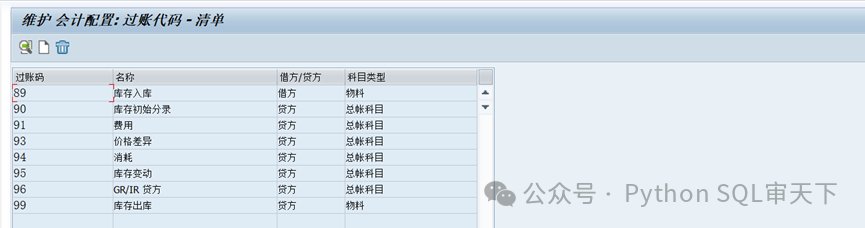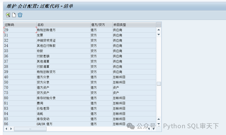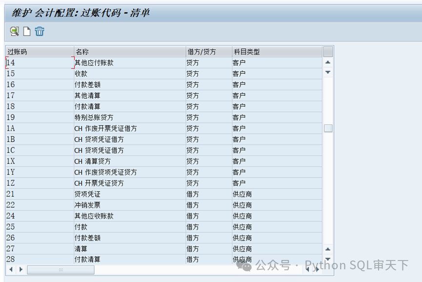 SAP系统预设了50余种记账码。我们可以通过事务码OB41来查看系统预设的所有记账码。