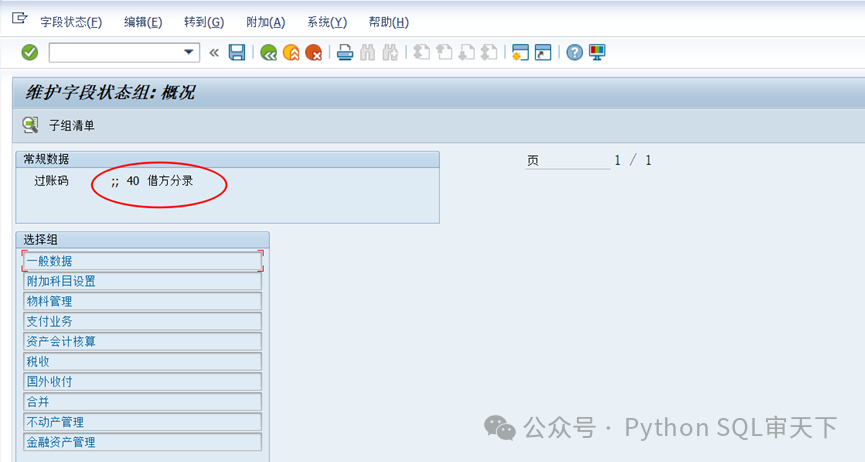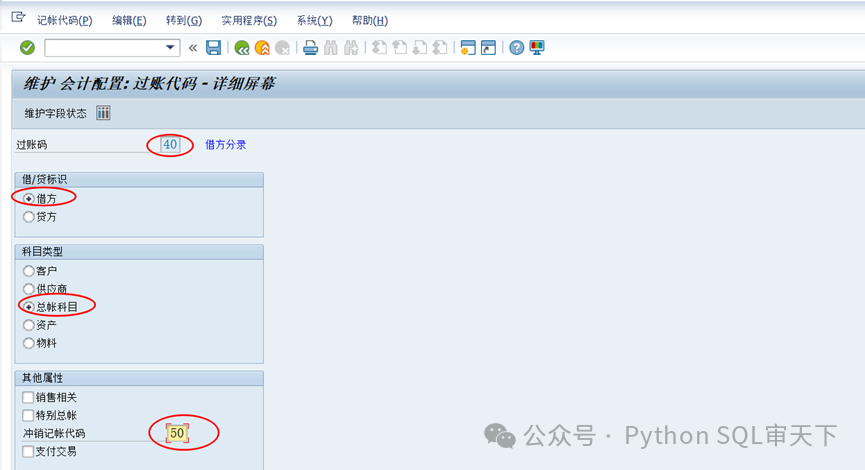 我们可以看到:记账码40代表借方分录,借/贷标识为借方,科目类型为总帐科目,冲销记账代码为50