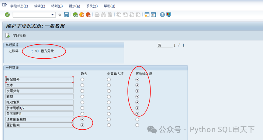 在实际输入凭证时,凭证行项目的字段状态是同时受记账码和科目的字段状态组控制的。如果一个字段状态组要求可选,另一个要求必输,那么最终结果将是必输,也就是说两者取最严格的。这一点尤其要注意。