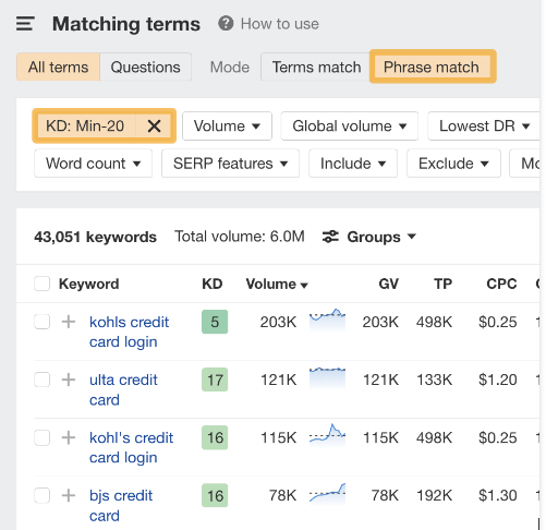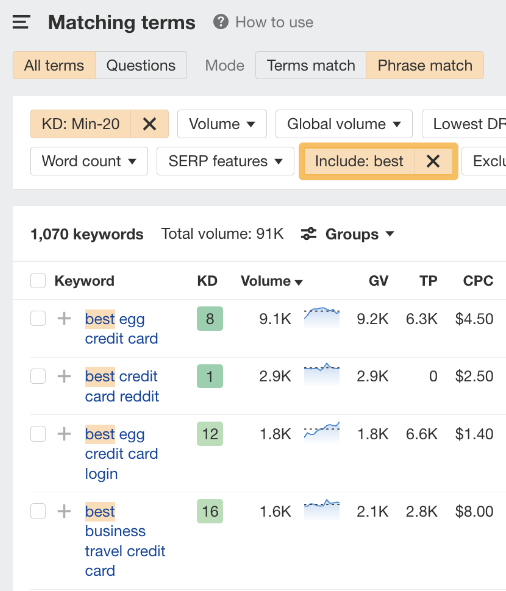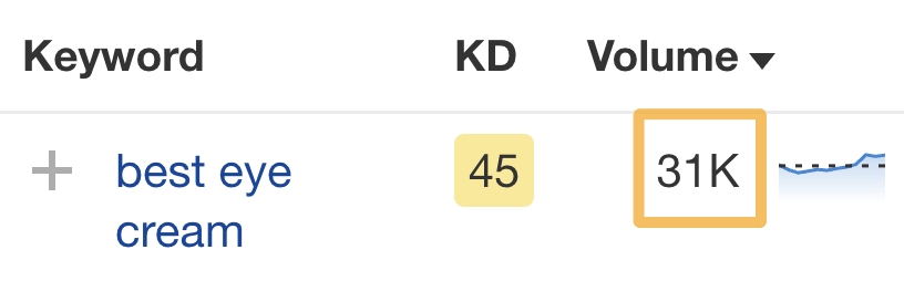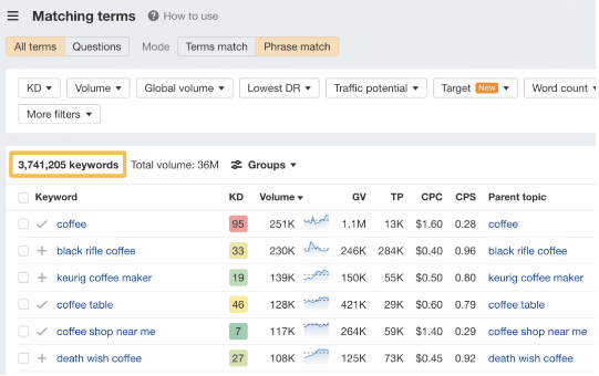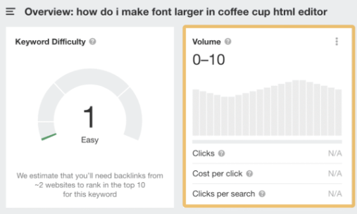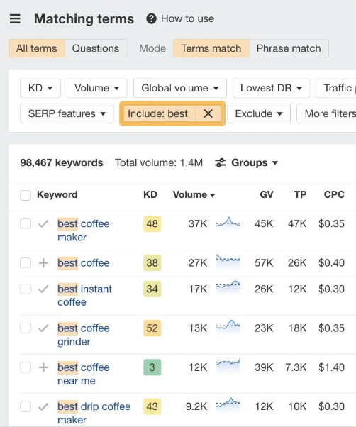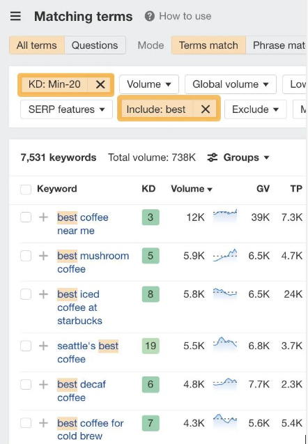 改善用户体验的关键在于关注访客的期望。问问自己,他们对网站的期望是什么。 4 锁定具有搜索流量潜力的主题 试图在无人搜索的关键词上排名是没有意义的。即使你排名第一,也不会获得流量。 例如,你销售软件教程。针对 “how do I make font larger in coffee cup html editor” 关键词进行排名是没有意义的,因为它几乎没有搜索量: ![]() 而排名靠前的页面获得的自然搜索流量几乎为零: ![]() 要找到人们正在搜索的主题,你需要一个关键词研究工具,如 Ahrefs Keywords Explorer(关键词分析)。输入一个宽泛的主题作为种子关键词,然后进入Matching terms(词匹配)报告。 例如,如果你有一个咖啡分销网站,你可以输入 “coffee” 作为种子。 ![]() 你会注意到,这些关键词想法是按其月搜索量排序的,因此很容易找到人们正在搜索的关键词。 不过,这里有很多想法(超过 370 万个),并非所有想法都适合你的网站。 例如,咖啡分销联盟网站试图在 “coffee cake recipe“上获得排名是没有意义的,因为其内容无法盈利。即使每月有 60K 次搜索也没有太多意义: ![]() 这时,过滤器就派上用场了。 例如,如果你想查找经典的 “best [任何]” 分销类联盟关键词,只需在 “包含” 过滤器中添加 “best” 一词即可: ![]() 然后,你可以过滤出 Keyword Difficulty(关键词难度、KD)较低的关键词,从而筛选出容易获得排名的关键词: ![]() 基本上,你要寻找的是具有流量潜力的相关关键词,并且这些关键词确实可以快速获得排名。 如果想批量找出低 KD 关键词,也可以使用 Keywords Explorer(关键词分析)。 方法如下: