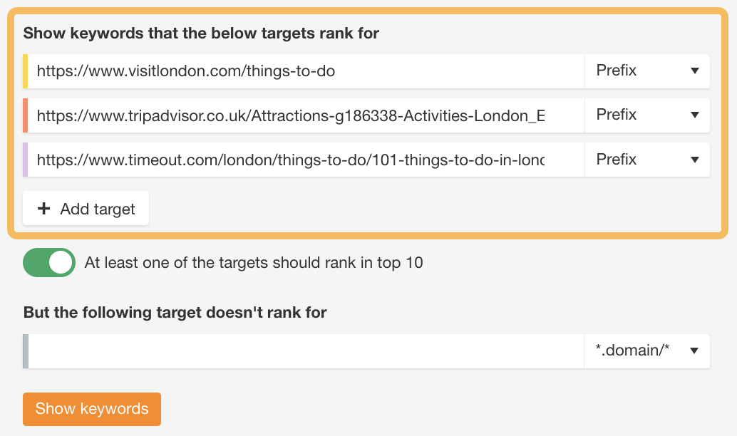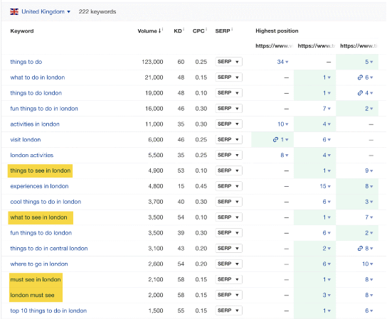 ![]() 内部链接还有助于 Google 了解页面的内容。 幸运的是,大多数 CMS 都会默认从至少一个其他页面为新网页添加内部链接。这些链接可能在菜单栏、博客主页或其他地方。 不过,在发布新内容时,手动添加来自其他相关页面的内部链接也是一种好的做法。 为此,请在 Site Audit(网站诊断)中的 Page Explorer(页面分析)中搜索你要的主题。 在本例中,我在搜索框中输入了关键词 “lsi”,并将下拉选项设置为 “Page text(页面文本)”。 ![]() 这将以与谷歌 site:搜索相同的方式在你的网站上找到关键词或主题的提及。这些都是添加内部链接的相关位置。 9 涵盖用户想知道的一切 谷歌希望为用户提供最好的内容排名,这些内容最好涵盖了用户想知道的一切。 这里有几种方法可以找出这些东西: 1、在排名靠前的网页上查找共同的子话题 打开两三个排名靠前的网页,打开 Ahrefs SEO Toolbar(Ahrefs SEO 工具栏),点击 “Content(内容)” 选项卡,就能找出常见的子话题。 我搜索了 “things to do in london”,发现 Tripadvisor 页面和 Lonely Planet 页面都提到伦敦塔是最值得游览的景点。 以下是 Tripadvisor 页面的内容结构: ![]() 这里的 Lonely Planet 页面也是如此: ![]() 我们可以看到,两者之间的共同的题目是 “Tower of London”。 这很可能是用户期望并希望在伦敦必做之事列表中看到的,因为多个排名靠前的网页都在谈论这件事。 2、进行内容差距分析 如果你想更进一步,可以进行内容差距分析。 方法如下: 将三个排名靠前的网页的 URL 粘贴到 Ahrefs Content Gap(内容差距机会)工具中。底部字段留空,点击 “Show keywords(显示关键词)”。 ![]() 然后,如果将 “Intersect(交集数量)” 设置为 “2”,就会显示至少有两个目标排名的搜索词。如果已经有不止一个页面对它们进行了排名,那么这些可能就是重要的子话题。 ![]() 这里有 222 种 “things to do in london” 的变体,如 “things to see in london”、“what to see in london” 和 “must see in london”。 这表明,观光是用户在伦敦感兴趣做的事情之一,他们希望得到推荐。 这些只是你可以涵盖的几个子话题,它们可以使你的内容更加全面。 10 获取更多反向链接以建立权重 反向链接就好比对你网站的信任投票。它们是 Google 算法的基础,也是最重要的 Google 排名要素之一。 谷歌在其 “搜索工作原理” 页面上证实了这一点,它是这样说的:
