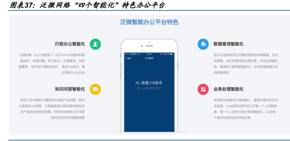 泛微网络是国内 OA 行业龙头企业,专注于协同管理软件领域,主要为政企客户提供统一的数字化办公平台。泛微独创的 OA 办公平台具备“四大智能化”特色——行政办公智能化、数据查询智能化、知识问答智能化与业务处理智能化,满足公司各类管理场景的需求。泛微 OA 平台功能强大,如跨平台数据查询方面,泛微智能办公平台能够直接询问公司截至目前的销售额、个人假期、费用收支等情况,并给出同期比较,帮助员工直观了解数据变化。简化办事流程及个人秘书方面,泛微智能办公平台的“小 E”是每位员工的 7×24 小时智能助手,为员工在处理问题、学习知识、办理事项、消息提醒等方面答疑解惑,并对技术和产品问题提供参考等。