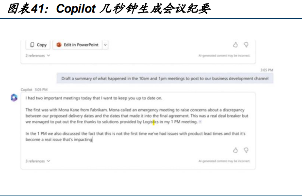 会议信息管理方面,Microsoft 借助 Microsoft Graph 将来自用户的 Word、PPT、电子邮件、日历、备忘录、联系人的数据汇集在一起。用户可以要求 Copilot 准备与某位客户的会议,Copilot 就会汇总各种来源的信息,在几秒钟内整理出一份总结报告。会议内容整理方面,Microsoft 的 Teams 通过输入相关指令,Copilot 能够实现实时总结、归纳会议要点,给予关于后续讨论和待办事项的建议等功能。会议记录梳理方面,Microsoft 能一次性生成多个会议的纪要并进行简要总结,鼠标悬停在文字上,就能获取更多详细信息,以便及时查漏补缺。