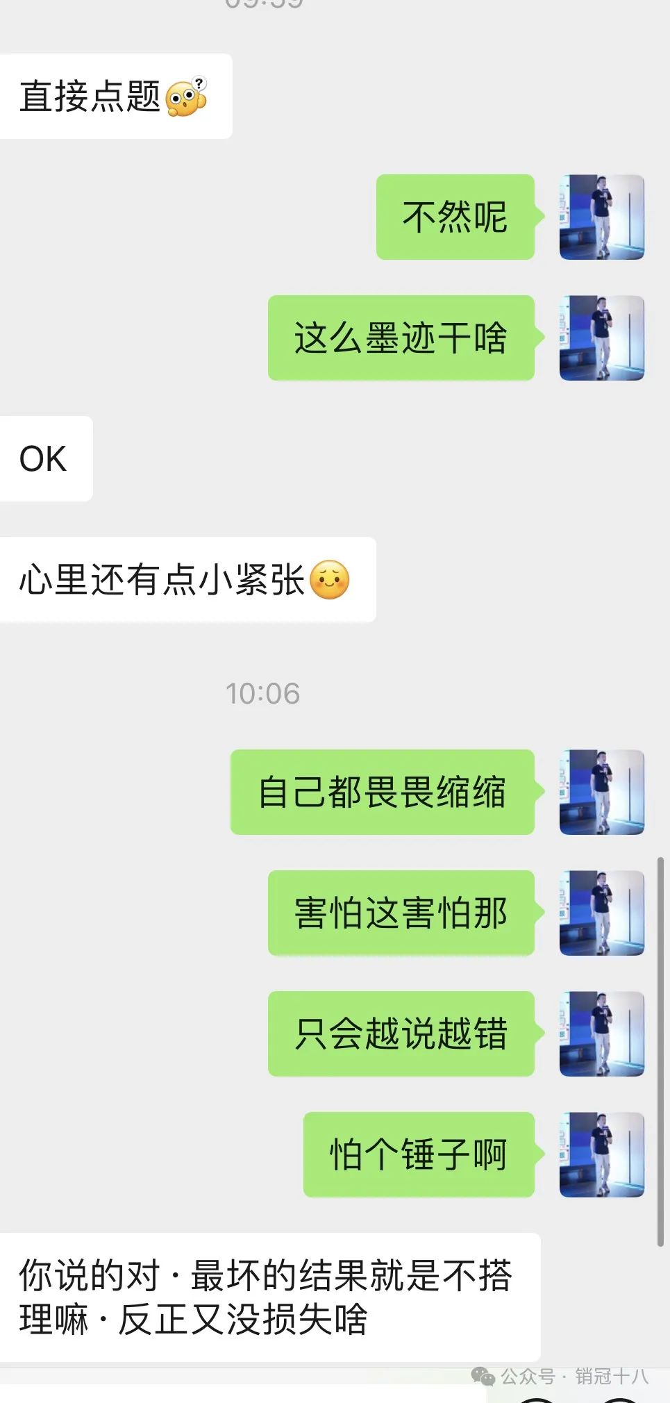 注意,是你内心所有想说的的,最真挚最带有情绪的话,客户真的还有意向,一定是会回复你的。 客户不回,是对方也还在纠结犹豫,你主动去点破尴尬就好。 比如,“我这敏感多疑的心啊,是不是不考虑咋们的xx,昨天我还信誓旦旦的和老板说,老板今天还笑我,是不是xx不想买了,又担心直接说,直接伤了我的心,哥,你直说,我扛得住,得不到你的回应,真的比拒绝我还难受。“ 不要照搬,根据自己的情况去用。 我实习做销售的时候,我的深夜给客户发的话术,被多名同时拿去用,都出单了,可惜没有截图,当年发给客户大概500字的小作文是真的好啊。 2、敢于把客户往外推 人性就是贱,客户有些也真的是贱。 你说优惠没有了吧,客户会觉得你在套路他。 你一直纠缠客户的话,客户更加不信,没有这个优惠了。 作为销售人员都知道,拿优惠说事更多只是逼单的一种方式。 但是这么好的逼单抓手,销售没用户。 你给客户发了优惠消息,客户不信或者不回,那你就要学会以退为进。 “xx,咋是不考虑这个优惠了是吧,好的,那我就先给我其他的客户了哈,等你考虑清楚,到时候我再帮你申请,申请不下来你也不要怪弟弟。“ 发完这条,不要主动去找客户了,不出48小时,客户真的是很需要,想最低价的,一定会来找你的。 还有一种话术也好用,适合喜欢对比的客户。 ”哥,我反复和老板对,做你这单亏不亏的,确实没什么利润,这次比较遗憾,但凡有点利润,都不会把你往外推的。“ 先退后进,是为了更好的进攻。 3、敢于要客户承诺 常见的。 客户要优惠,你反问对方,我帮你申请到,你是不是可以定下来。 客户说,下次约,我看了下,我的排期,那咋们是周四还是周五方便呢? 客户有承诺,才算有效的跟进哈。 总之,作为销售人员,你一定不要畏手畏脚的,担心说错话。 你总是害怕说错话,你越会说错,心理学叫自证预言。 你都业绩差成这个死样子了,就去大量聊嘛,聊死就及时复盘下一个,爱谁谁爱咋滴,我又不是只有你一个客户。 心态对了,你做事就顺了。 销售本身就是概率性事件 ,不可能聊一个成一个,乔吉拉德也做不到的。 下篇文章,写写销售中最难的一环,怎么稳住自己的心态,你不出业绩,心态才是你最大的问题。 靠!写的太投入,机场广播台在喊我名字了。。。