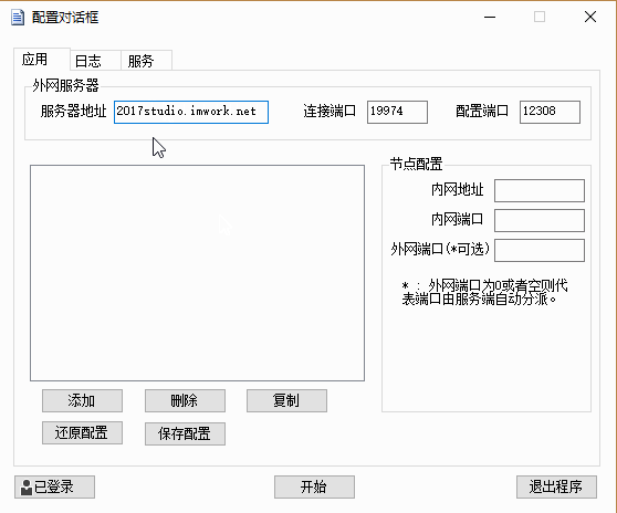 { "ProviderWebPort": 12309, //服务器端口 "ProviderAddress": "2017studio.imwork.net", //服务器地址 //反向代理客户端列表 "Clients": [ {//mstsc远程控制服务 "IP": "127.0.0.1", //反向代理机器的ip "TargetServicePort": "3389" //反向代理服务的端口 "ConsumerPort":"3389" //外网访问端口,如被占用,则会从20000开始按顺序分配端口 }, {//网站服务 "IP": "127.0.0.1", "TargetServicePort": "80" }, {//ftp服务 "IP": "127.0.0.1", "TargetServicePort": "21", "IsCompress" : true, //表示启动传输压缩 "Description": "这是一个ftp协议。" //描述字段,方便用户在服务端界面识别 }, {//mosh服务 "IP": "192.168.0.168", //安装mosh服务的受控端地址 "TargetServicePort": "60002", "ConsumerPort": "30002", "Protocol": "UDP" //表示是一个UDP协议,如果不加以配置,则以TCP协议来转发 } ] }