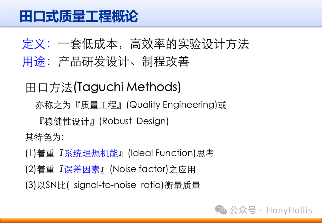 田口 DOE 法能以低成本、高效率找出设计或制程最佳条件组合,使变异最小化。通过考虑误差因素和以 SN 比衡量质量,提升产品稳定性与可靠性,增强企业竞争力,在产品研发设计和制程改善中发挥关键作用。 该文章在 2024/11/16 9:23:20 编辑过 |