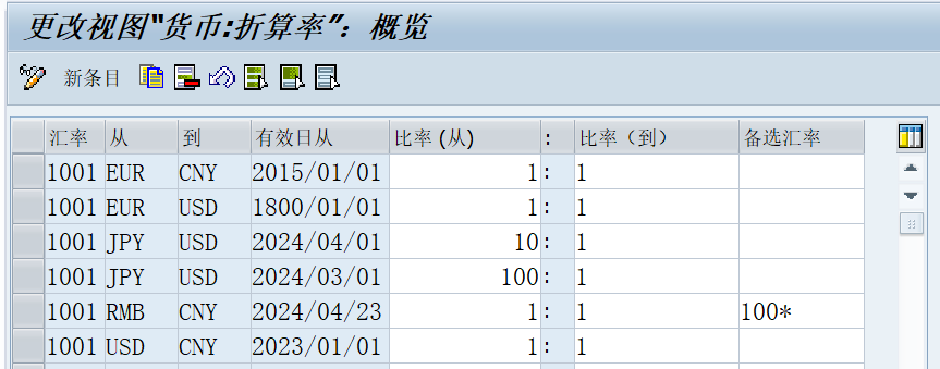 声明:本文仅代表作者观点和立场,不代表任何公司!仅用于SAP软件应用学习参考。使用SAP的企业一般都有对外贸易业务,因此,不可避免地会涉及外币核算,由于汇率变动非常频繁,如果每一笔记账都按实时汇率录入,则工作量很大,所以SAP系统解决方案是定期把最新汇率维护在系统内,做外币相关的业务时候系统会自动取到最新的汇率,不需要手工录入(比如如下)。