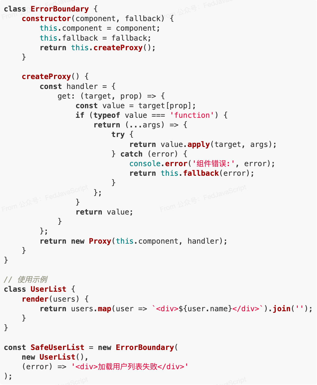 在React应用中,使用错误边界可以防止整个应用因局部错误而崩溃。虽然普通JavaScript没有类似机制,但我们可以实现类似的隔离效果。