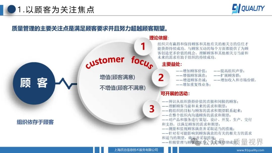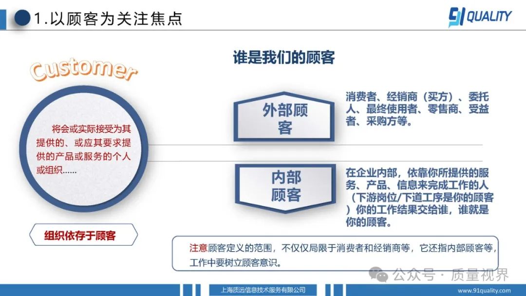 1、以顾客为关注焦点:深入了解顾客需求,包括潜在需求。例如苹果公司通过不断创新产品功能和提升用户体验,满足了消费者对于便捷、高效和高品质电子产品的需求。确保组织的目标与顾客需求和期望相结合,将顾客满意度作为衡量工作成效的重要指标。