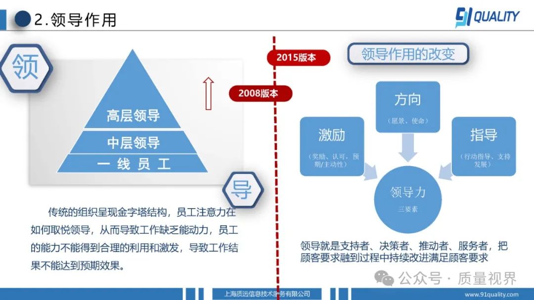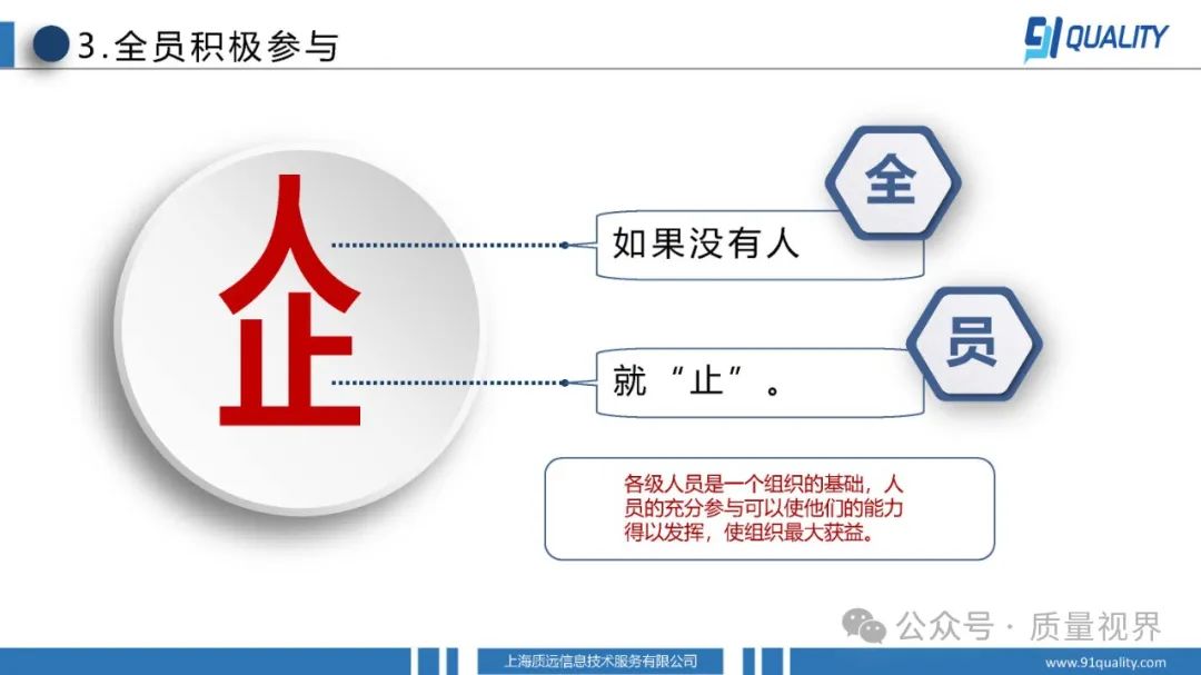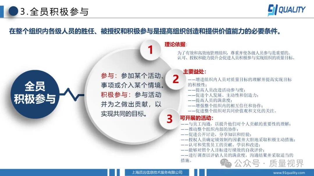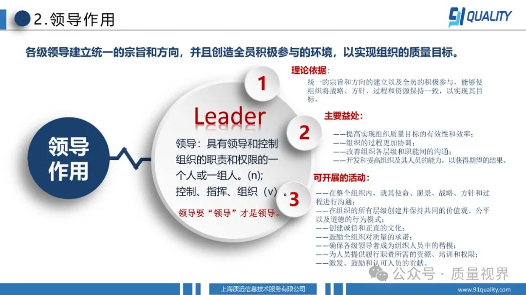 2、领导作用:领导者要为组织制定清晰的质量方针和质量目标,指明发展方向。如华为的任正非提出了 “以客户为中心,以奋斗者为本” 的核心价值观,引领华为在全球通信和科技领域取得巨大成功。