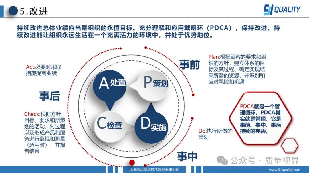 4、过程方法:识别和确定组织内的关键过程,例如产品设计开发过程、生产制造过程、售后服务过程等。对每个过程进行策划、实施、检查和改进,即 PDCA 循环,确保过程的有效性和效率。丰田公司的生产过程管理就是过程方法的优秀典范,通过不断优化生产流程,实现了高质量和高效率的生产。