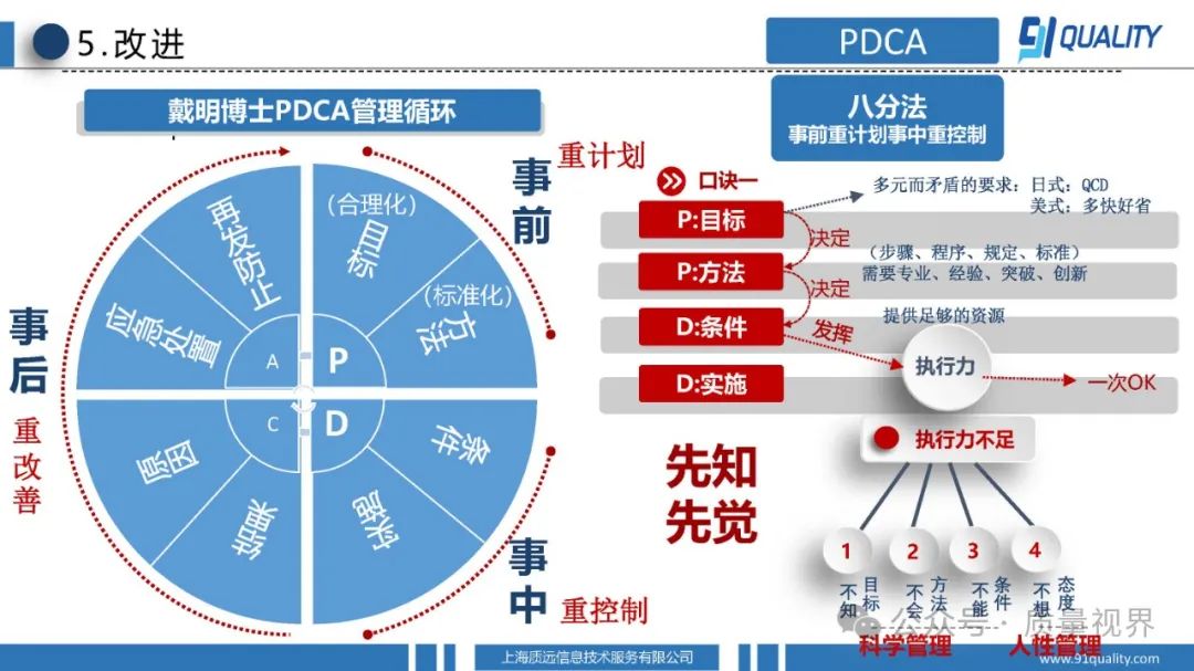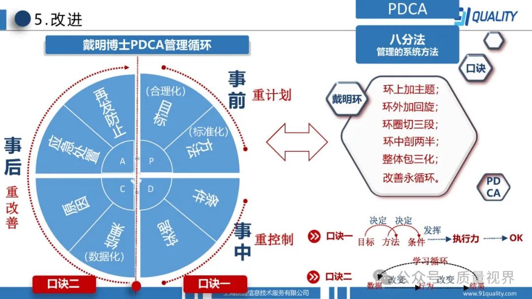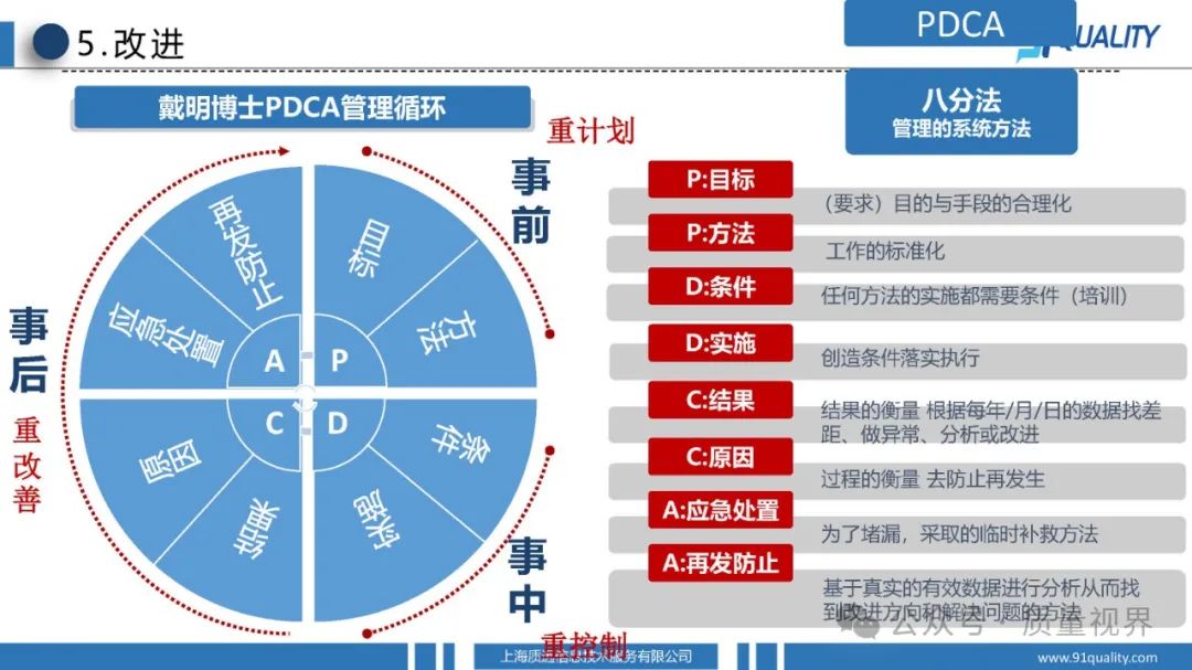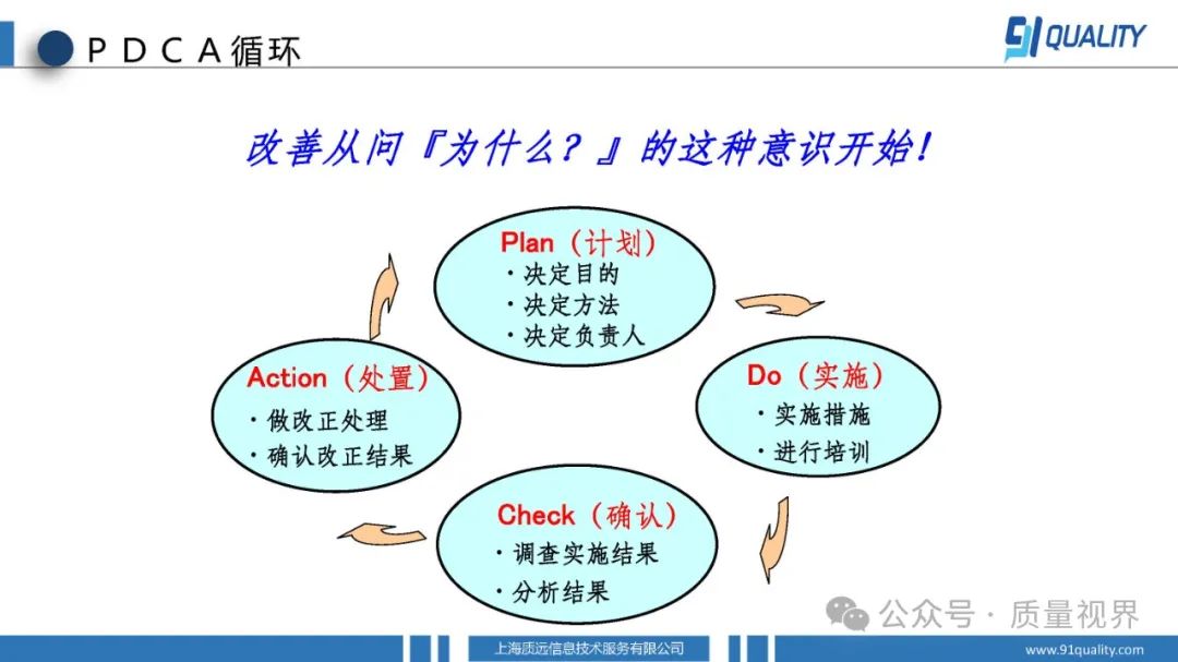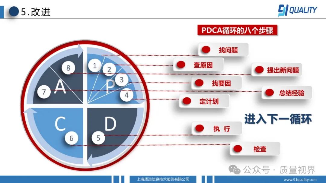 5、改进:建立持续改进的机制和文化,鼓励员工发现问题并及时提出改进建议。如海尔集团的 “日清日高” 管理模式,要求员工每天对工作进行总结和改进。运用各种质量管理工具和方法,如六西格玛、精益生产等,对组织的产品、服务和管理过程进行持续改进。