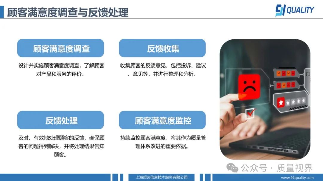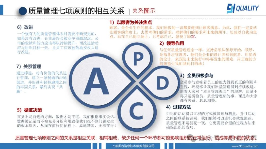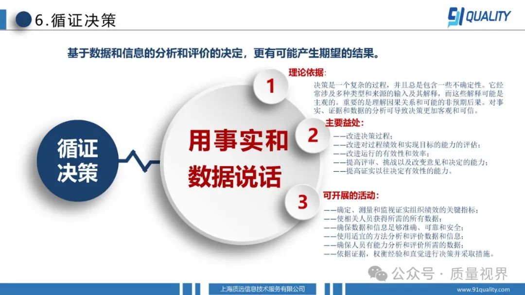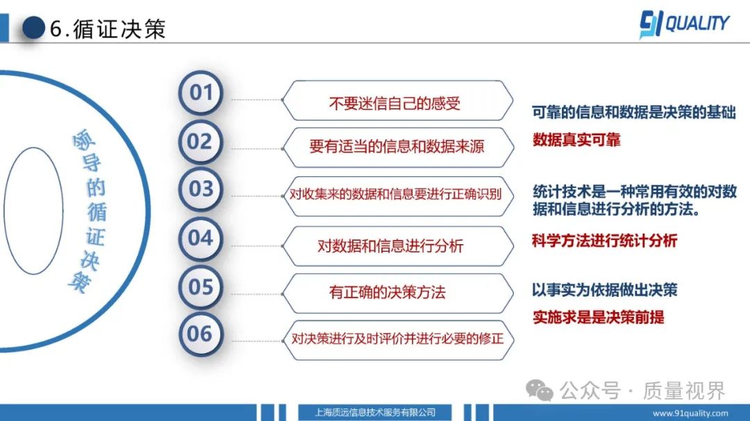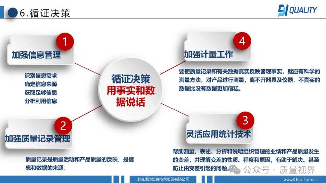 6、循证决策:收集和分析与质量管理相关的数据和信息,包括顾客反馈、生产数据、质量检测数据等。例如电商企业通过分析大量的顾客评价数据,来改进产品和服务质量。