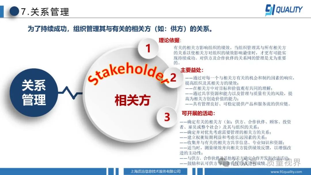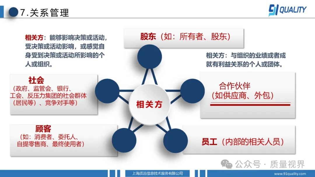 7、关系管理:识别组织的相关方,包括供应商、合作伙伴、顾客、员工等,并建立良好的沟通和合作关系。