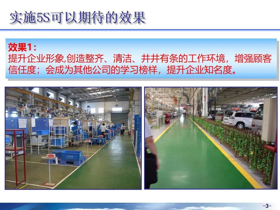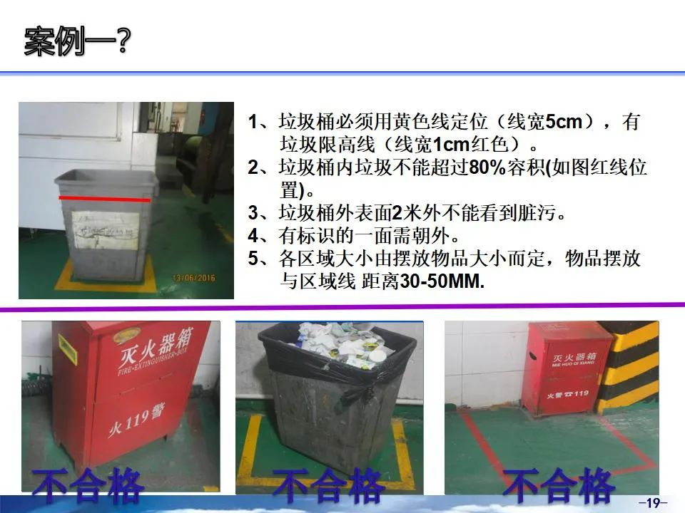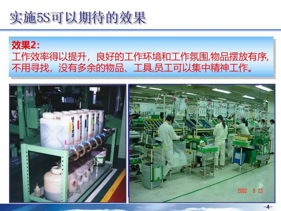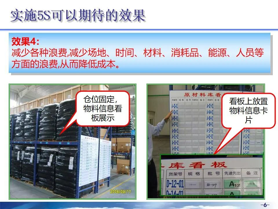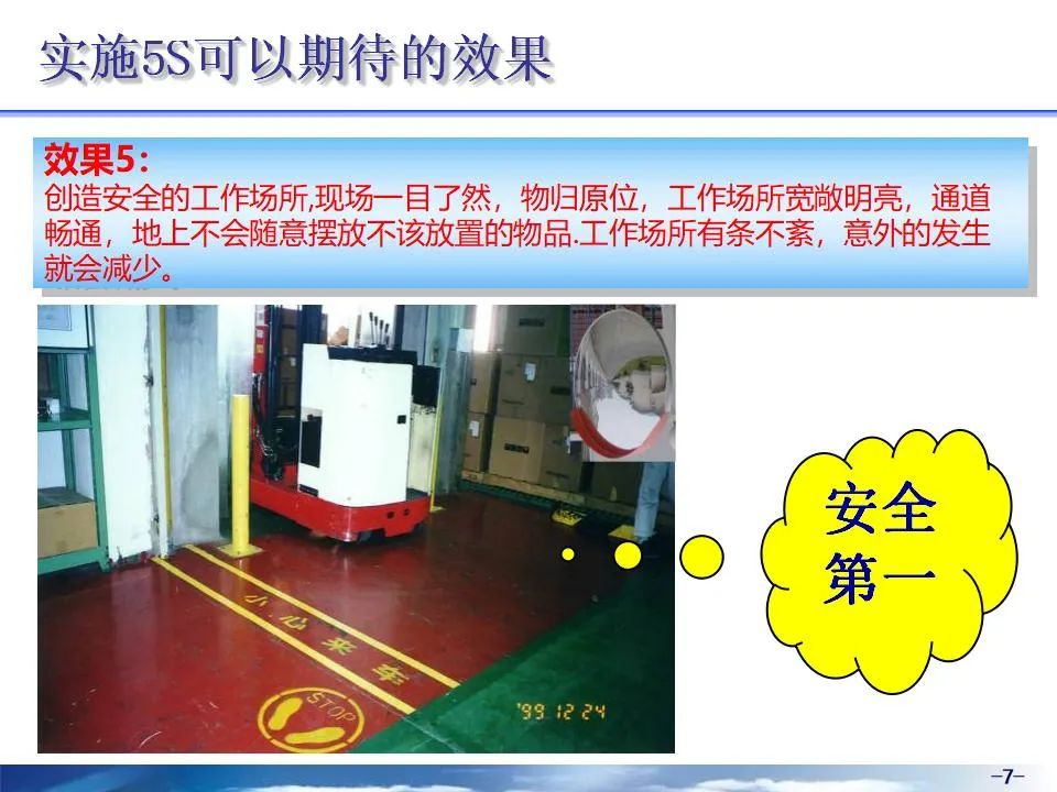 通过整顿,可以实现工作环境的规范化和标准化,进一步提升工作效率。 实施5S可以期待的效果1. 提升企业形象实施5S管理能够创造整齐、清洁、井井有条的工作环境,这不仅有助于增强顾客的信任度,还能提升企业的整体形象。一个整洁有序的工作场所往往会给客户留下深刻的印象,甚至成为其他公司的学习榜样,从而提升企业的知名度。 例如,当客户参观工厂时,看到干净整洁的车间、规范的操作流程和整齐摆放的工具,会自然地对企业产生信任感,认为这样的企业能够生产出高质量的产品。 2. 提升工作效率良好的工作环境和工作氛围是提高工作效率的关键。通过6S管理,物品摆放有序,员工无需花费大量时间寻找工具或材料。此外,去除多余的物品和工具后,员工可以更加集中精神地工作,从而显著提升工作效率。 例如,通过整顿,员工可以在几秒钟内找到所需的工具,而不是在杂乱的工具箱中浪费时间。这种时间的节省在长期工作中会积累成显著的效率提升。 3. 构筑品质保证基础优良的产品品质往往源于优良的工作环境。通过6S管理中的清扫和点检,可以及时发现设备的潜在问题,避免因污物或故障导致机器损坏,从而维持设备的正常运行状态。这不仅有助于提高产品品质,还能减少因设备故障导致的生产中断。 例如,定期清扫设备可以防止灰尘和污垢积累,从而延长设备的使用寿命并减少维修成本。同时,通过点检可以及时发现设备的异常,及时进行维护,确保生产过程的稳定性。 4. 减少浪费,降低成本实施6S管理能够有效减少场地、时间、材料、消耗品、能源和人员等方面的浪费。例如,通过明确物品的放置位置和数量,可以避免过度采购和库存积压;优化工作流程可以减少不必要的动作和时间浪费。这些措施最终能够帮助企业降低成本,提升经济效益。 例如,通过整顿,企业可以减少不必要的库存,从而节省仓储空间和管理成本。同时,优化的工作流程可以减少员工的无效劳动,提高整体生产效率。 5. 创造安全工作场所安全是企业生产中最重要的目标之一。通过6S管理,现场一目了然,物归原位,工作场所宽敞明亮,通道畅通无阻,地面上不会随意摆放不该放置的物品。这种有序的环境能够显著减少意外事故的发生,保障员工的人身安全。 例如,通过清扫和整顿,可以确保地面没有杂物,减少滑倒或绊倒的风险。同时,明确的标识和规范的物品放置可以防止工具或材料的误用,从而减少工伤事故。 实施步骤1. 第一步:定点摄影定点摄影是6S管理的起点,其目的是记录现场的初始状态,为后续的改善提供对比依据。具体操作包括: