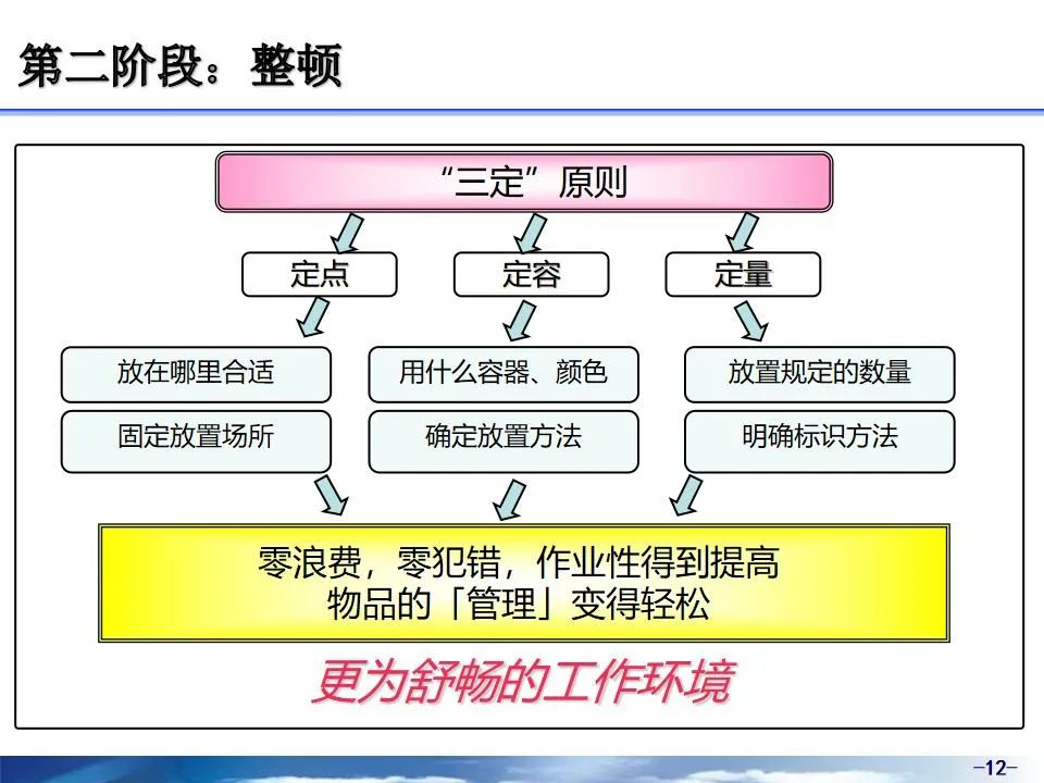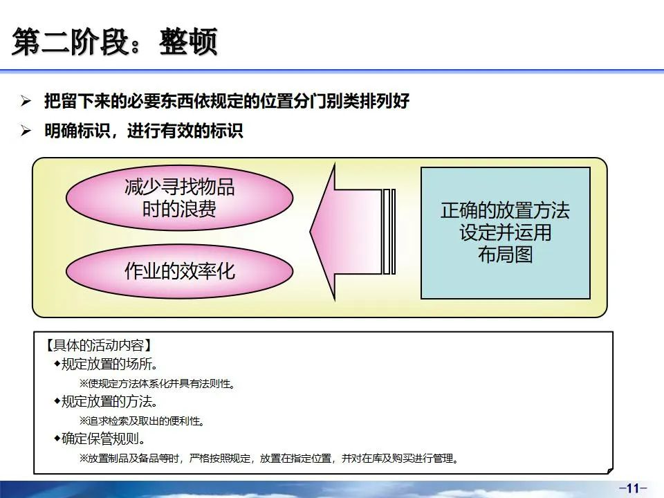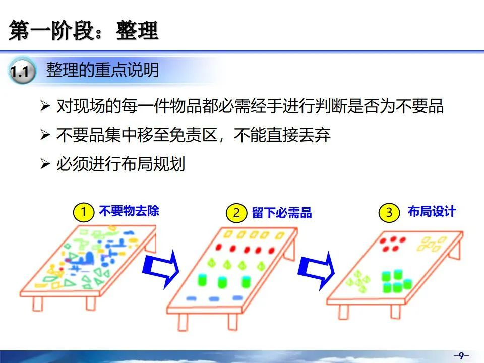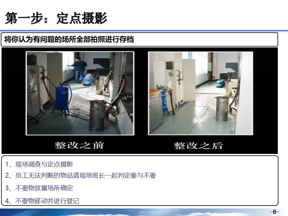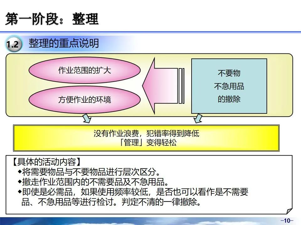 定点摄影不仅有助于记录现状,还能在改善过程中随时对比,直观地展示改善成果。 2. 第一阶段:整理整理阶段的核心是对现场的每一件物品进行判断,去除不要品,扩大作业范围,优化工作环境。具体活动内容包括: