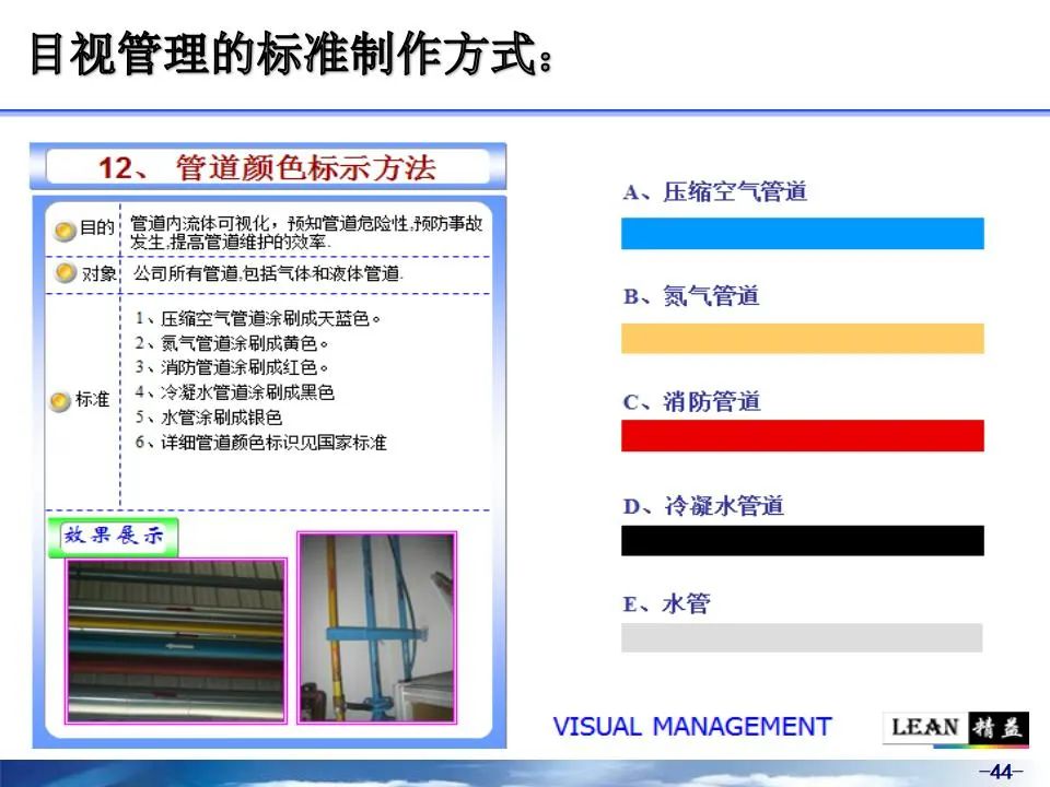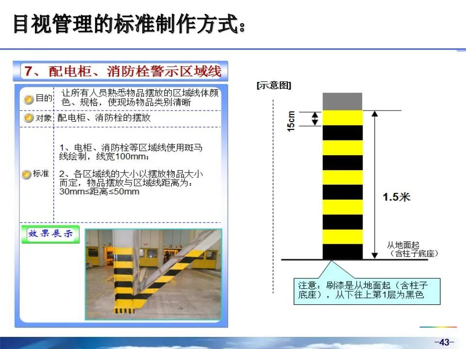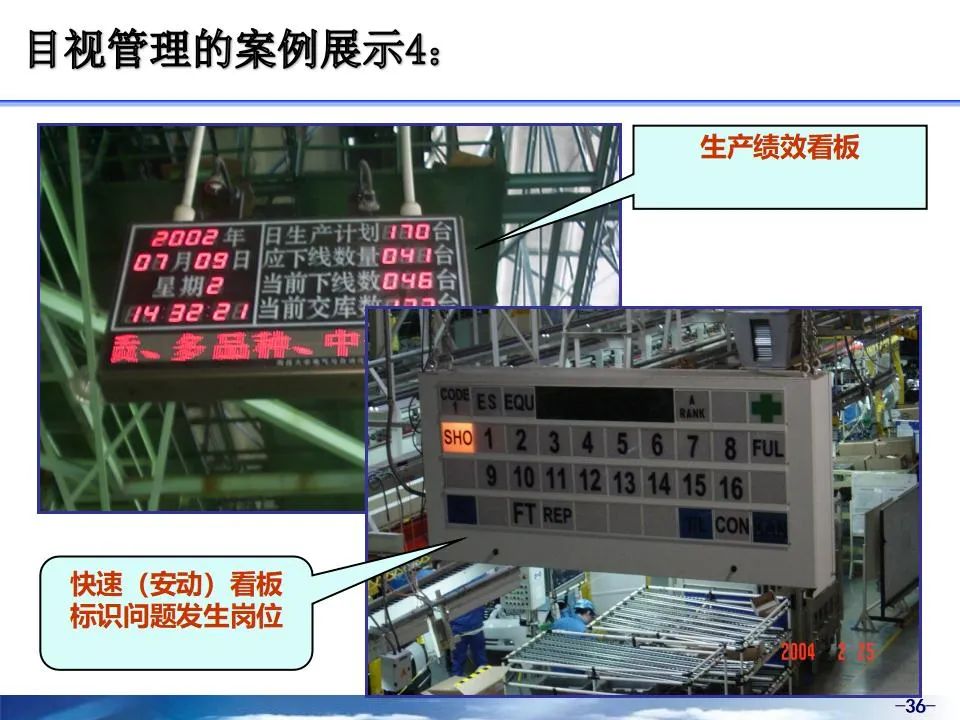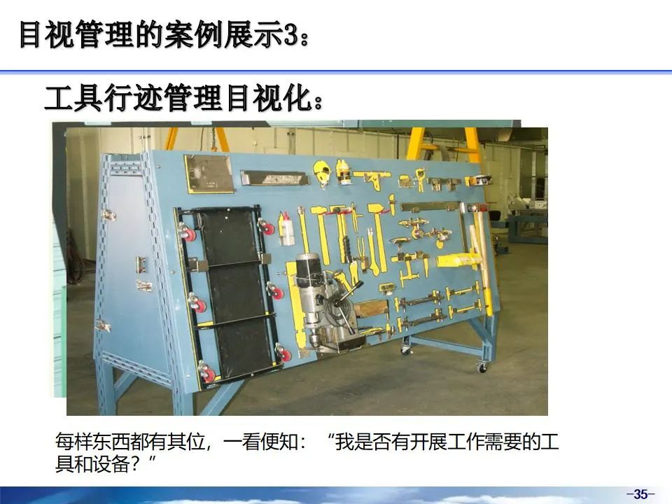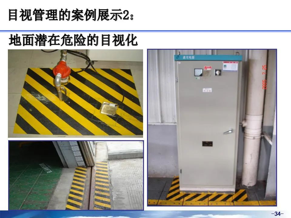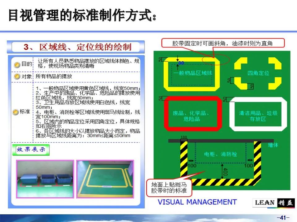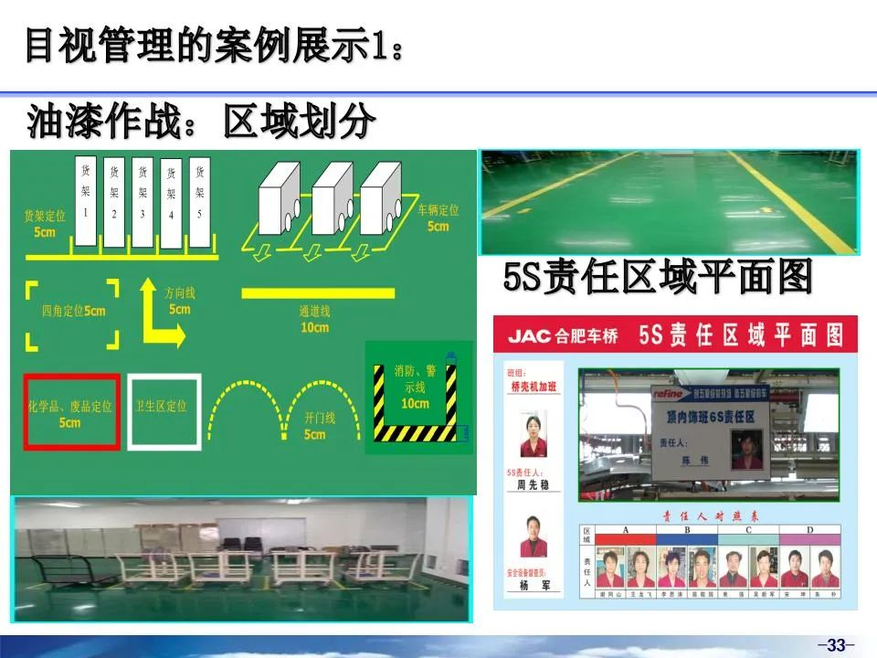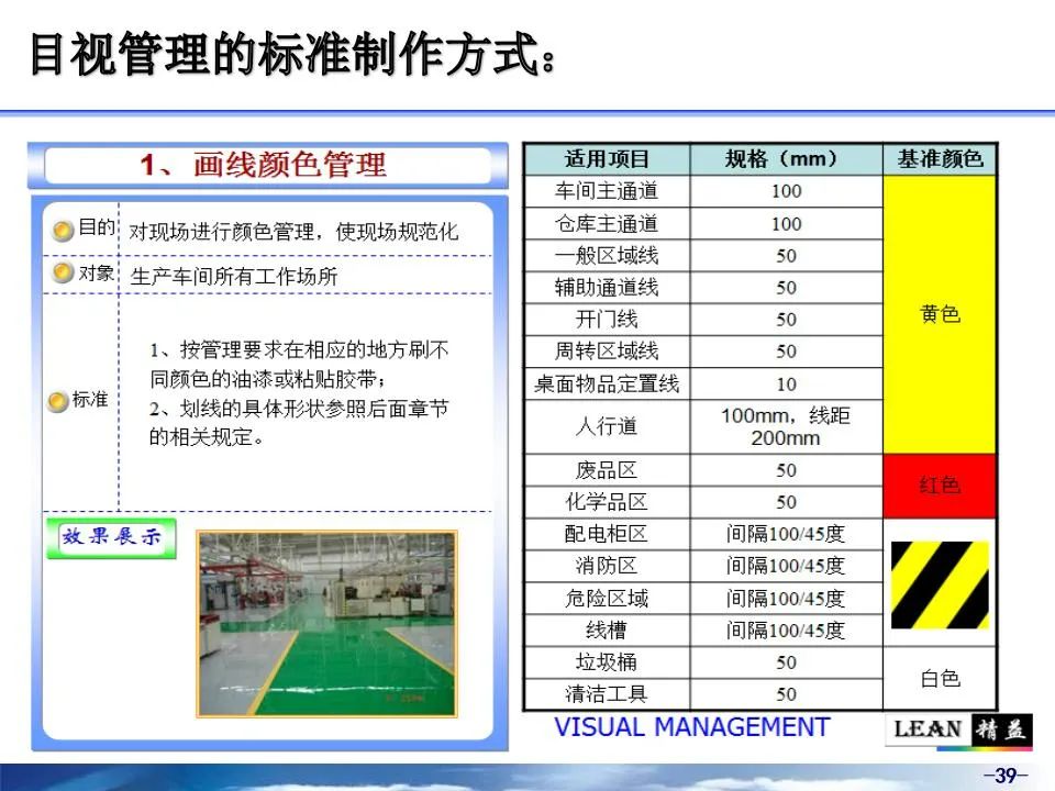 通过这些方向的目视化管理,可以全面提升企业的现场管理水平。 目视化管理的案例展示以下是几个目视化管理的实际案例: 1. 区域划分通过油漆作战,明确5S责任区域平面图,使每个区域的职责一目了然。例如,使用不同颜色的油漆划分生产区、仓储区和办公区,确保员工清楚各自的职责范围。 2. 地面危险目视化通过标识潜在危险区域,提醒员工注意安全。例如,在通道边缘使用黄色警示线,或在危险区域使用红色标识,提醒员工注意潜在风险。 3. 工具行迹管理通过工具箱的标识,确保每样工具都有其固定位置,一看便知是否齐全。例如,在工具箱内使用轮廓标识显示工具的放置位置,确保工具使用后能够归位。 4. 生产绩效看板通过快速(安动)看板,标识问题发生岗位,便于及时处理。例如,使用看板显示每个岗位的生产进度和异常情况,方便管理人员及时发现并解决问题。 5. 设备运转状态目视化通过颜色或标识显示设备的运行状态,便于员工快速判断。例如,使用绿色标识表示设备正常运行,红色标识表示设备故障,黄色标识表示设备待维修。 这些案例展示了目视化管理在实际应用中的多样性和有效性。 目视化管理的标准制作方式目视化管理需要遵循一定的标准制作方式,以确保其规范性和有效性。具体标准包括: