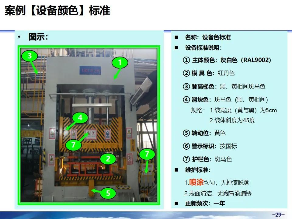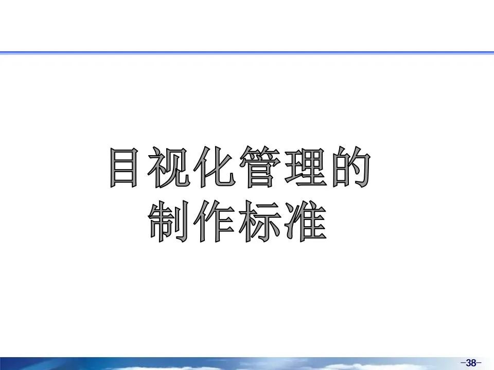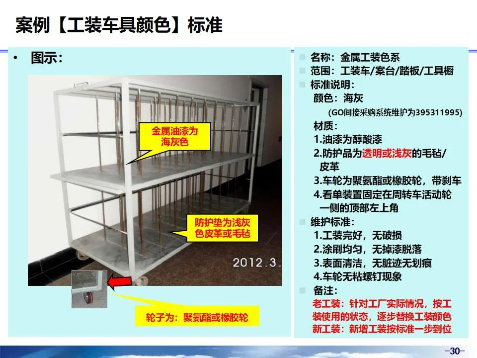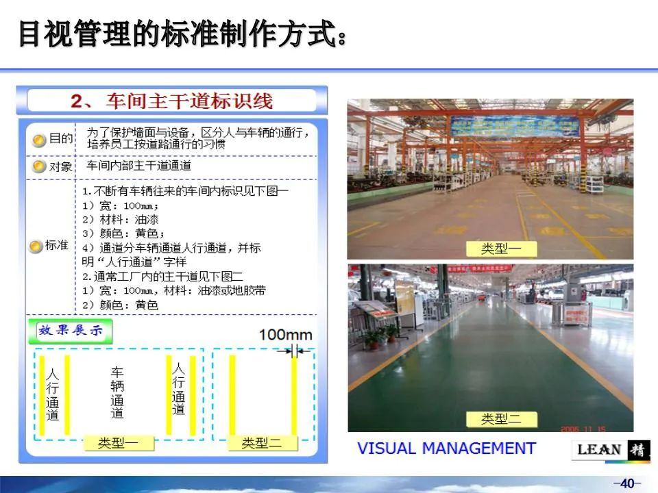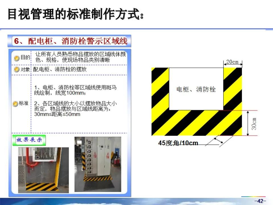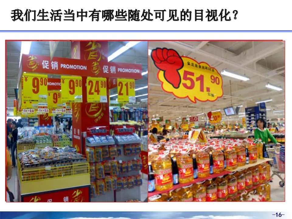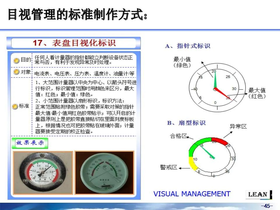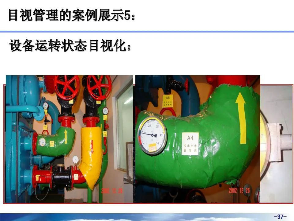 通过这些方向的目视化管理,可以全面提升企业的现场管理水平。 目视化管理的案例展示以下是几个目视化管理的实际案例: 1. 区域划分通过油漆作战,明确5S责任区域平面图,使每个区域的职责一目了然。例如,使用不同颜色的油漆划分生产区、仓储区和办公区,确保员工清楚各自的职责范围。 2. 地面危险目视化通过标识潜在危险区域,提醒员工注意安全。例如,在通道边缘使用黄色警示线,或在危险区域使用红色标识,提醒员工注意潜在风险。 3. 工具行迹管理通过工具箱的标识,确保每样工具都有其固定位置,一看便知是否齐全。例如,在工具箱内使用轮廓标识显示工具的放置位置,确保工具使用后能够归位。 4. 生产绩效看板通过快速(安动)看板,标识问题发生岗位,便于及时处理。例如,使用看板显示每个岗位的生产进度和异常情况,方便管理人员及时发现并解决问题。 5. 设备运转状态目视化通过颜色或标识显示设备的运行状态,便于员工快速判断。例如,使用绿色标识表示设备正常运行,红色标识表示设备故障,黄色标识表示设备待维修。 这些案例展示了目视化管理在实际应用中的多样性和有效性。 目视化管理的标准制作方式目视化管理需要遵循一定的标准制作方式,以确保其规范性和有效性。具体标准包括:
