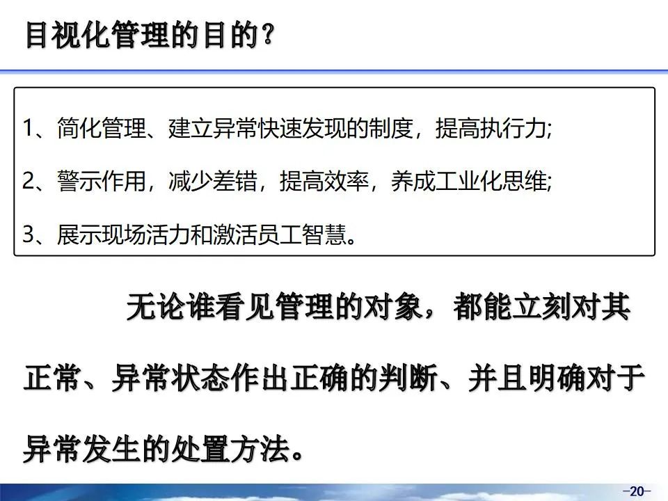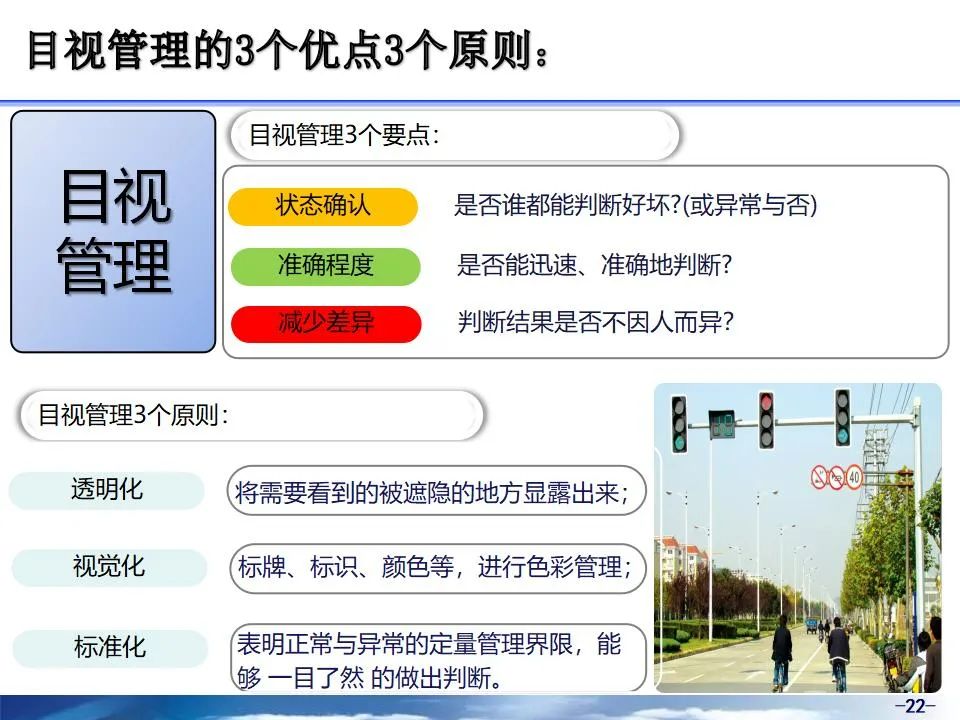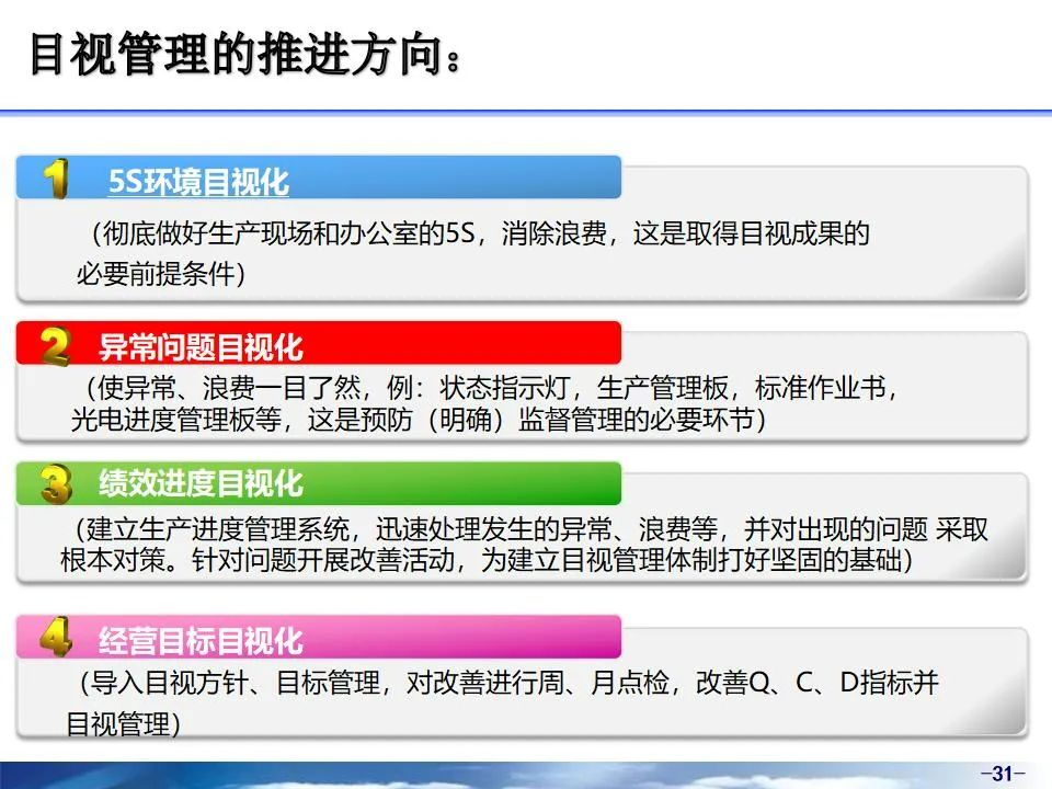 通过整顿,可以实现工作环境的规范化和标准化,进一步提升工作效率。 目视化管理目视化管理的定义目视化管理是一种通过视觉感应引起人的意识变化的管理方法。其核心在于利用视觉元素(如标识、颜色、图表等)直观地传达信息,使管理对象的状态一目了然。例如,通过颜色区分设备状态、用标识标明物品位置等,都能帮助员工快速理解和操作。 目视化管理的关键在于“一目了然”,即通过视觉元素快速传递信息,减少语言和文字的依赖。这种方法不仅适用于生产现场,还可以应用于办公室、仓库等任何需要管理的场所。 目视化管理的目的目视化管理的主要目的是简化管理流程,快速发现异常,提高执行力。具体目标包括: