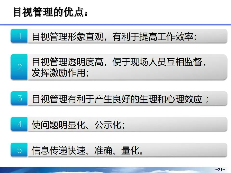 此外,目视化管理还要求无论谁看到管理对象,都能立刻对其正常或异常状态作出正确判断,并明确异常处理方法。这种方法可以确保管理的一致性和有效性。 目视化管理的优点目视化管理具有以下三大优点: