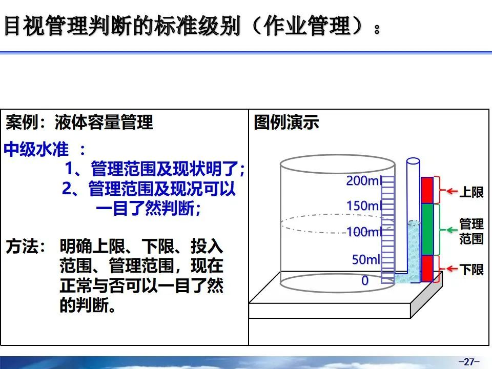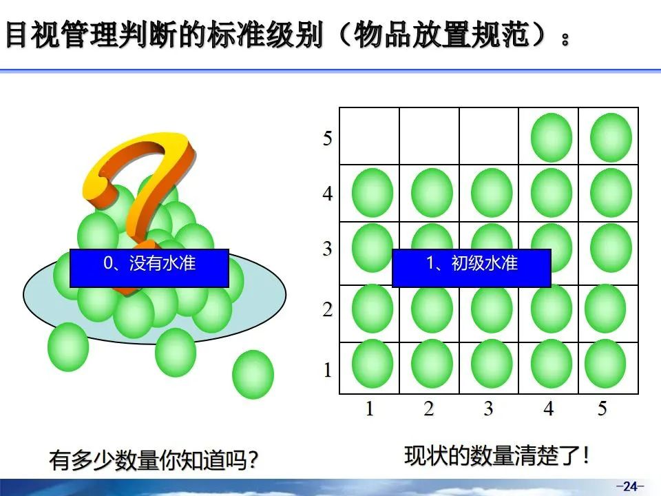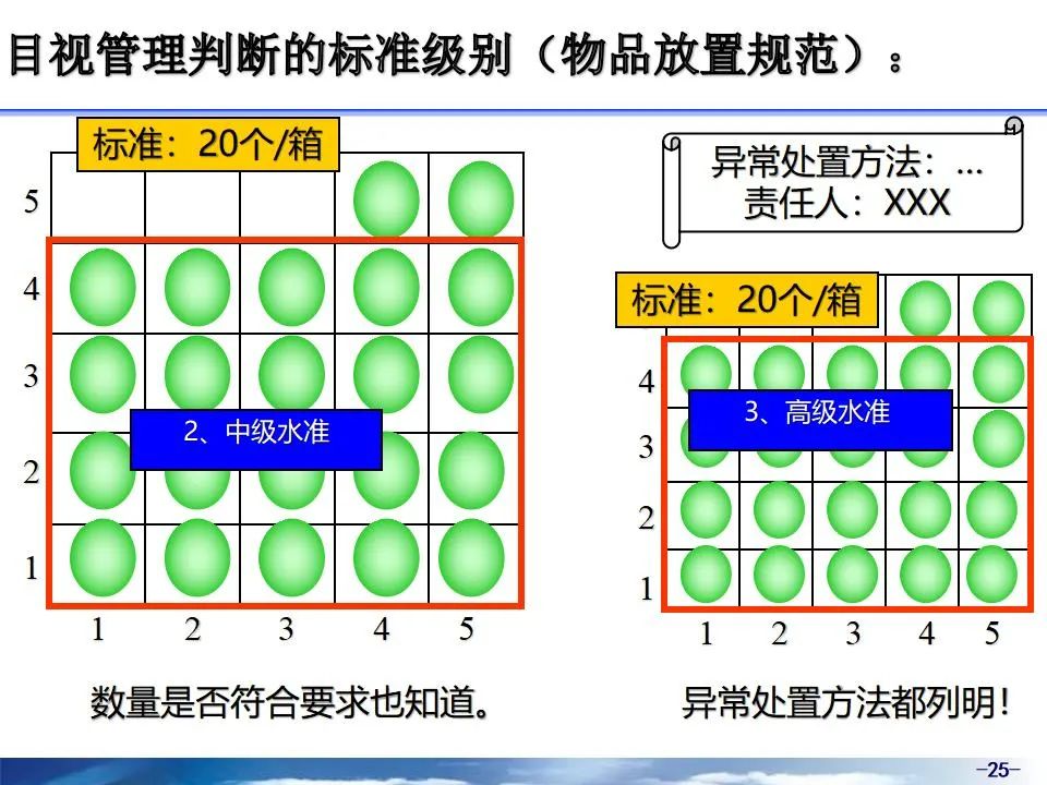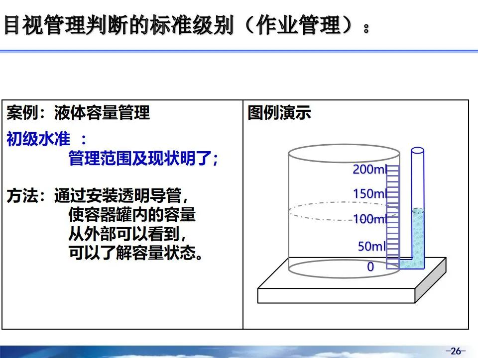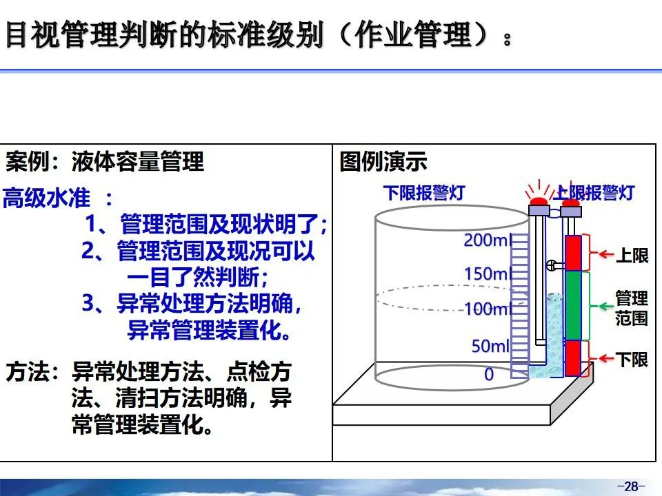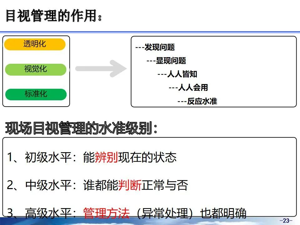 通过这些作用,目视化管理能够有效提升现场管理水平,优化工作流程。 目视化管理的水准级别目视化管理的水准可以分为三个层次: