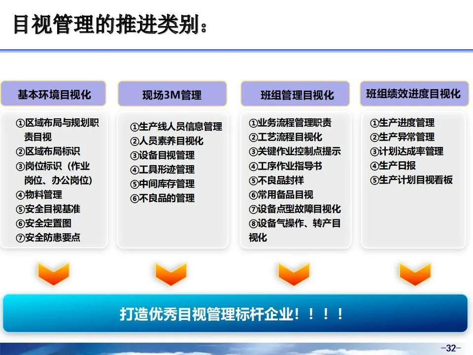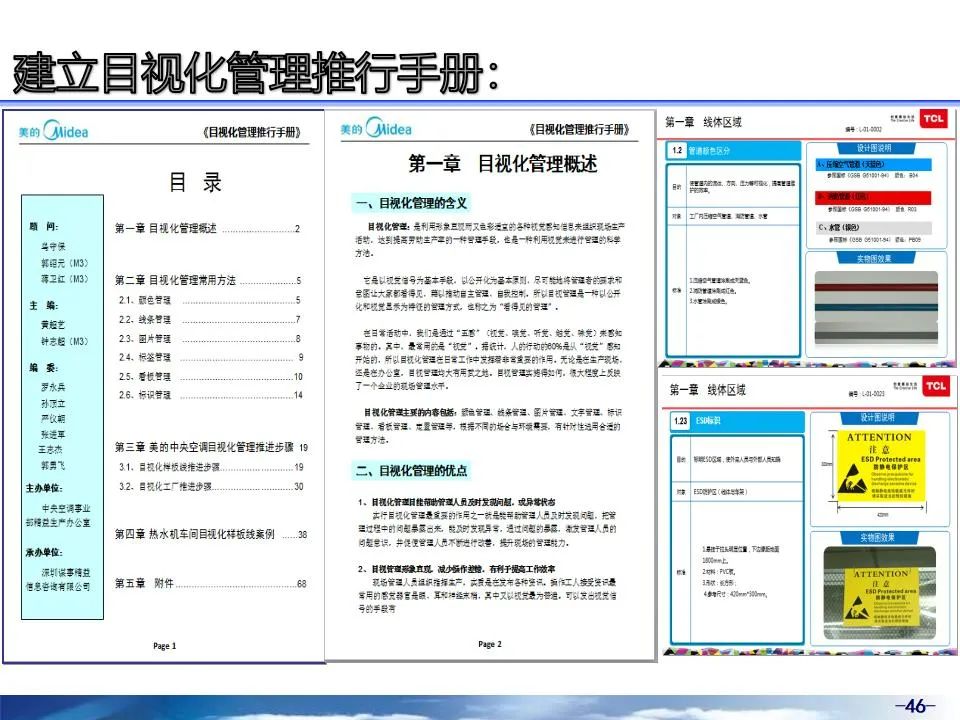 通过标准化的制作方式,可以确保目视化管理的统一性和可操作性。 目视化管理的推行手册为了确保目视化管理的持续性和有效性,企业应建立专门的推行手册。手册中应详细记录目视化管理的标准、制作方法和维护要求,以便员工随时查阅和执行。 推行手册的内容可以包括:
