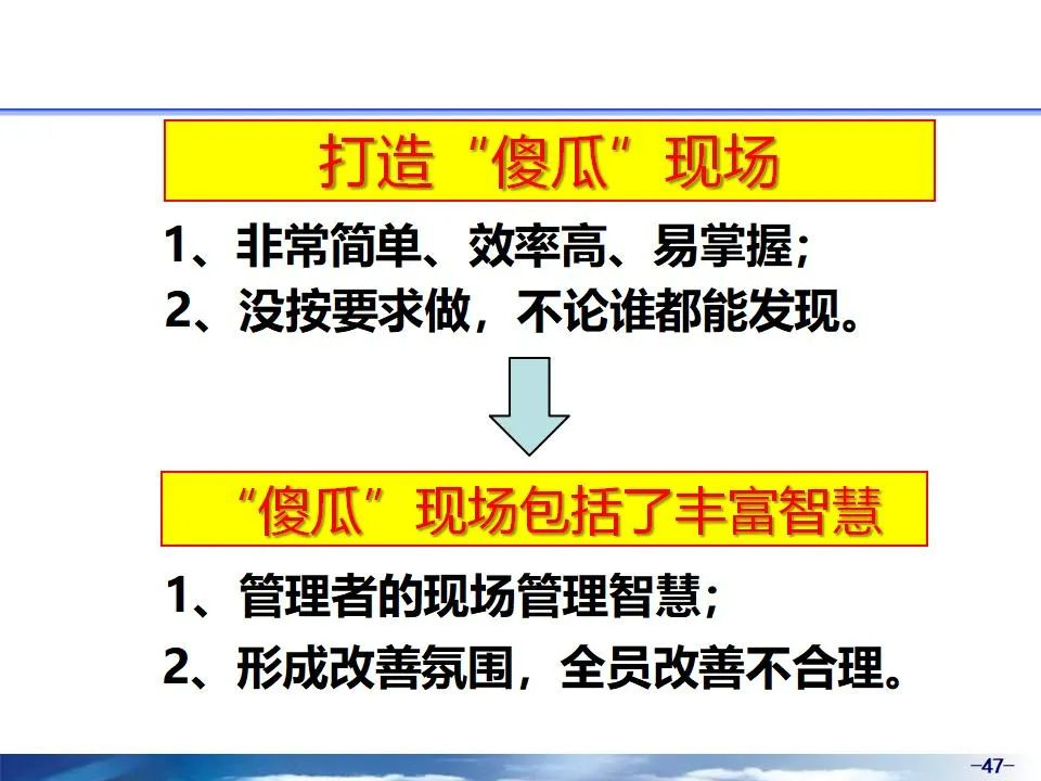 通过推行手册,企业可以确保目视化管理的标准化和一致性,避免因人员变动或操作不当导致的管理混乱。 打造“傻瓜”现场“傻瓜”现场是指通过简单、直观的管理方式,使任何员工都能轻松理解和操作的工作环境。其特点包括: